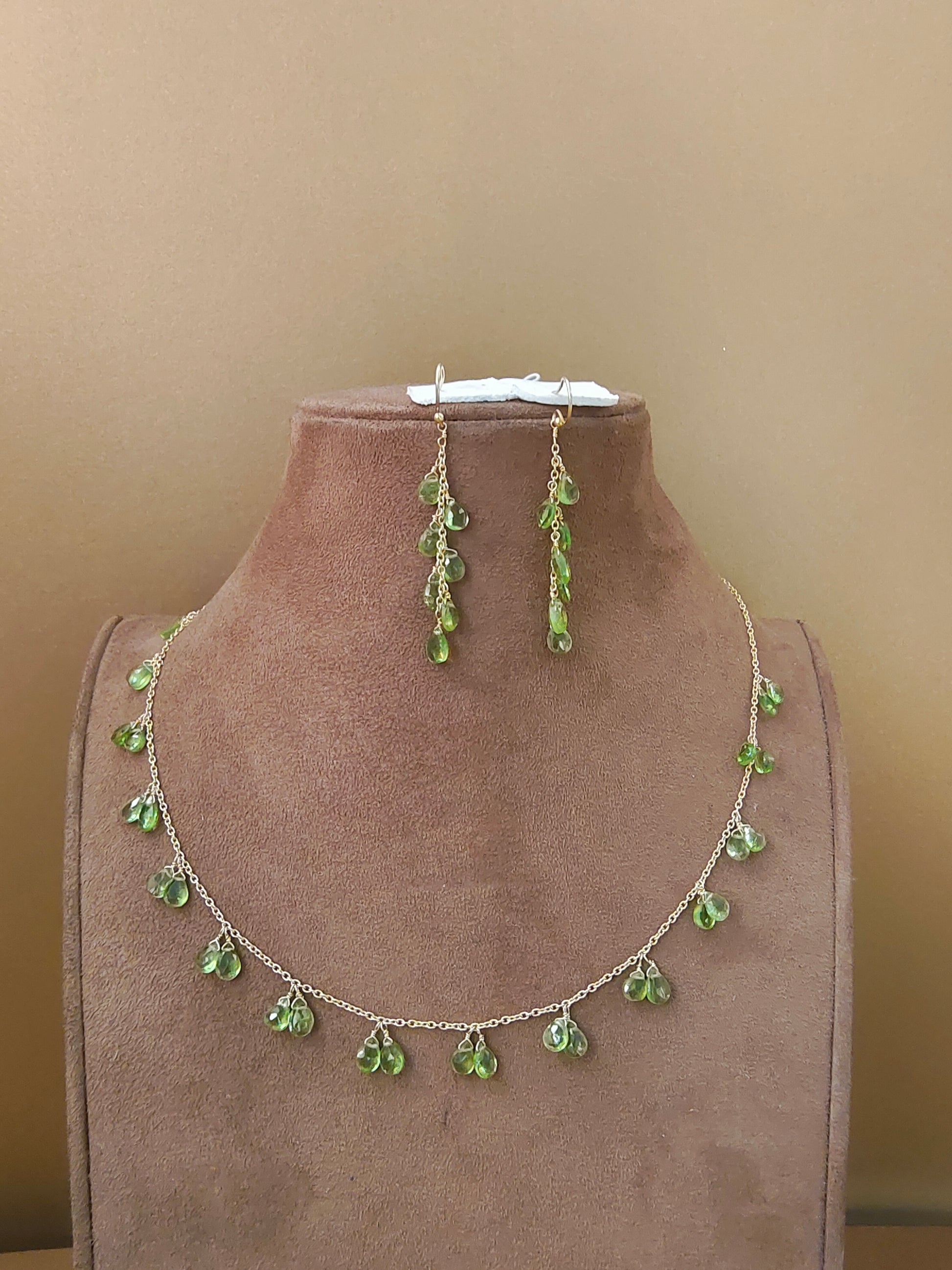 Delicately strung peridot briolettes on a gold plated silver chain.
