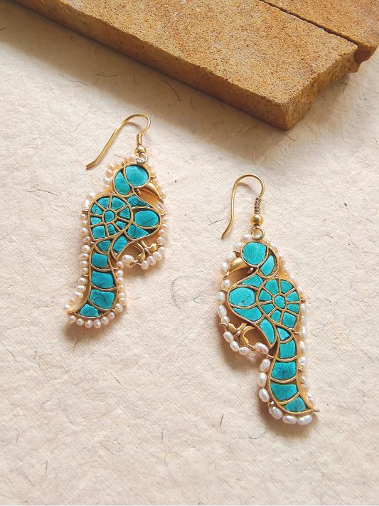 Charming and full of character, this handcrafted pair of silver parrots is set with vibrant reconstituted turquoise, capturing a playful yet regal spirit. Each parrot is delicately framed with hand-set seed pearls, adding a touch of vintage elegance and refined detail. A whimsical statement piece that celebrates craftsmanship and color.