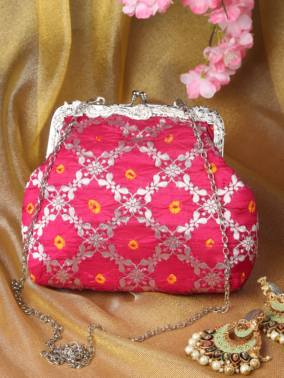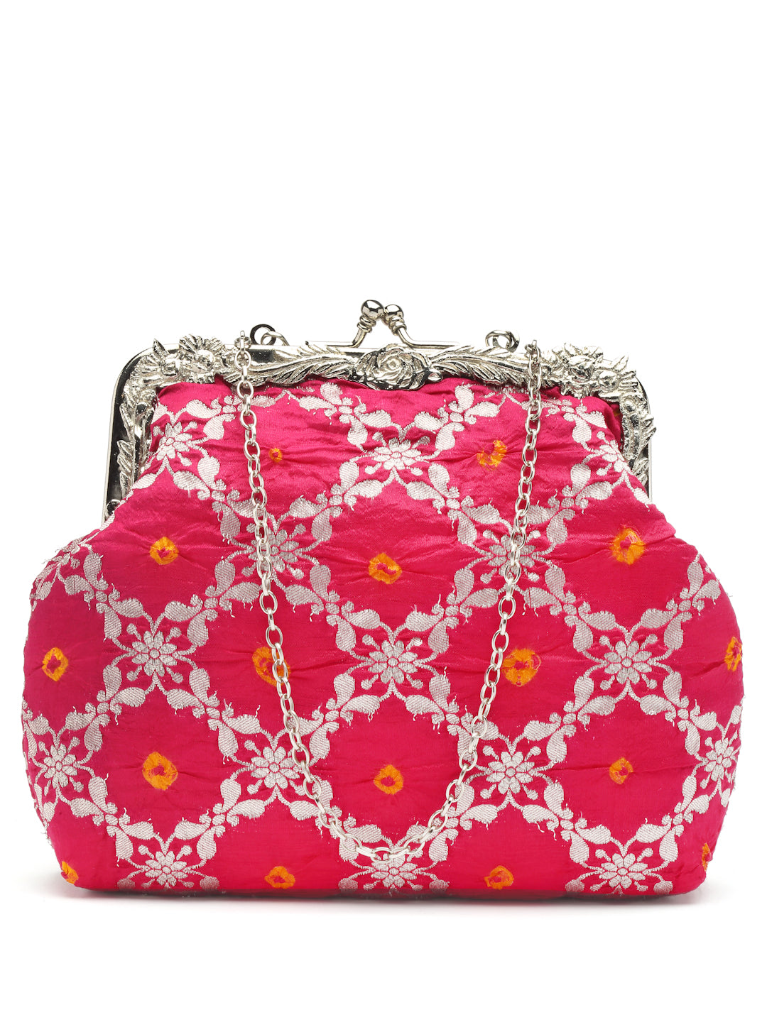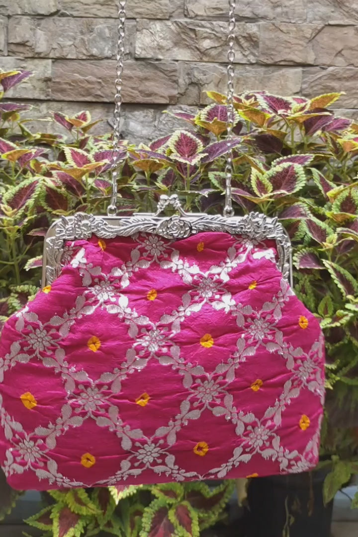 All-over floral arabesque pattern in silk tie and dye and brocade stitched on an antique kiss lock half frame. It has a detachable chain handle.