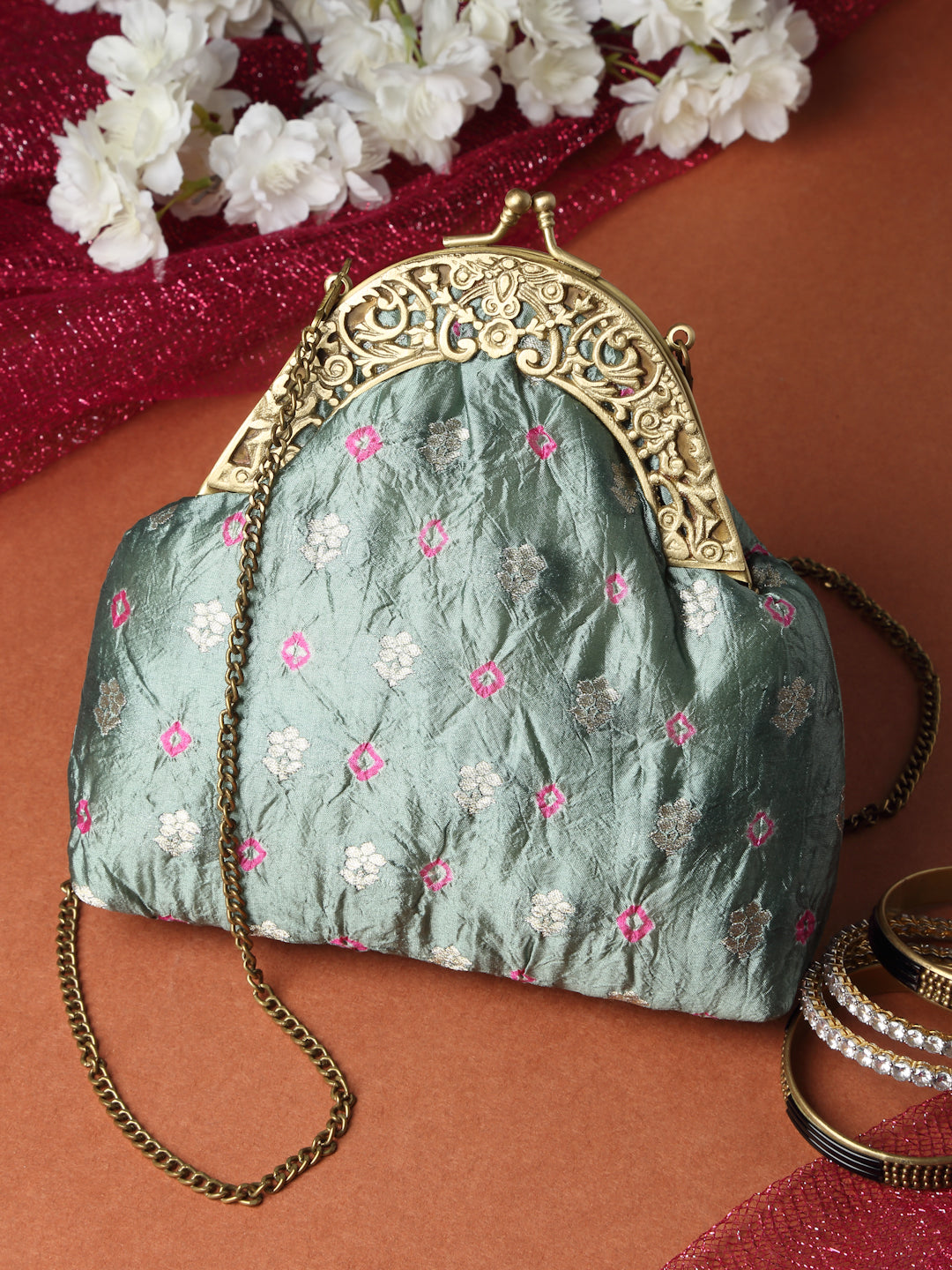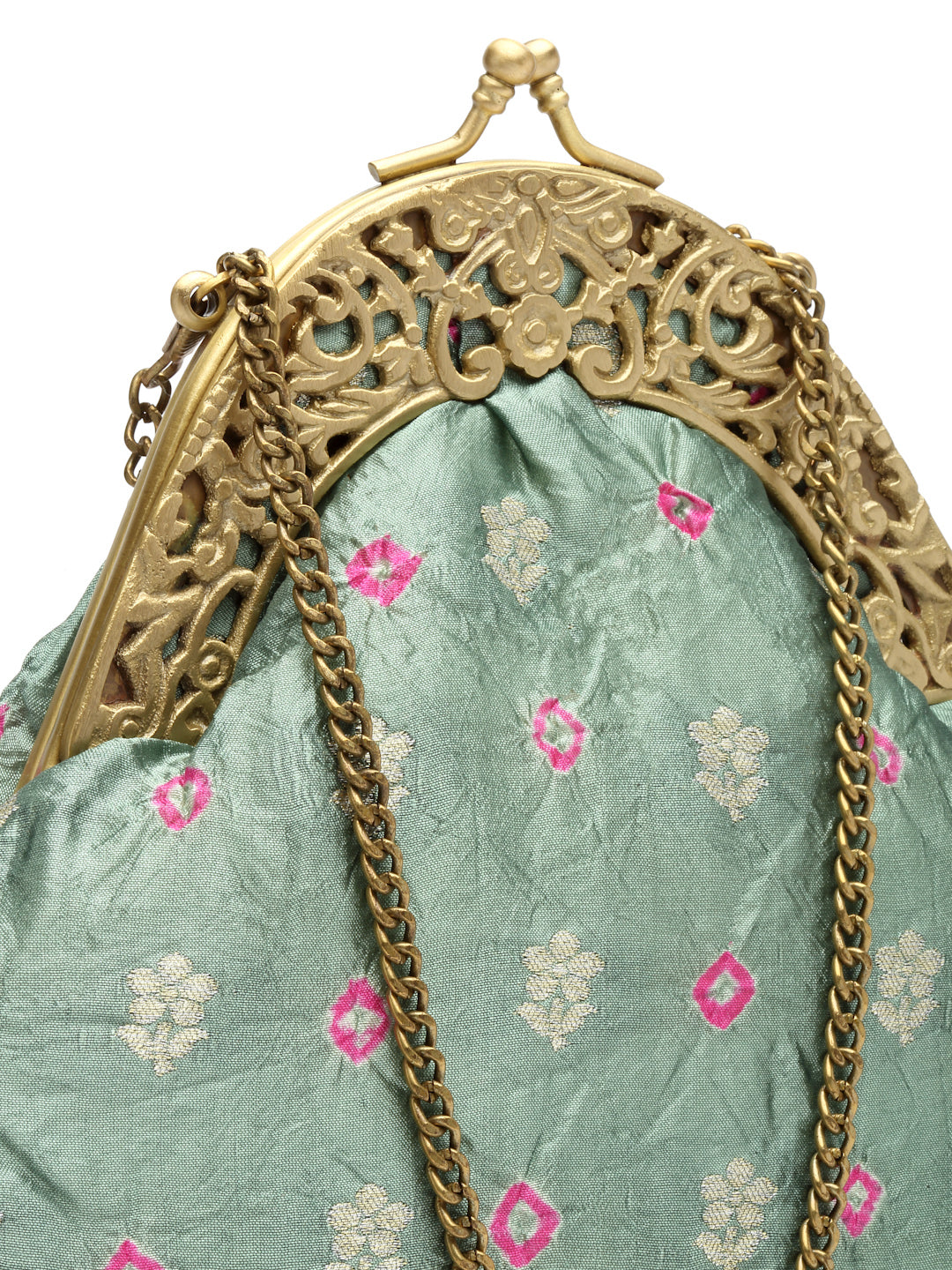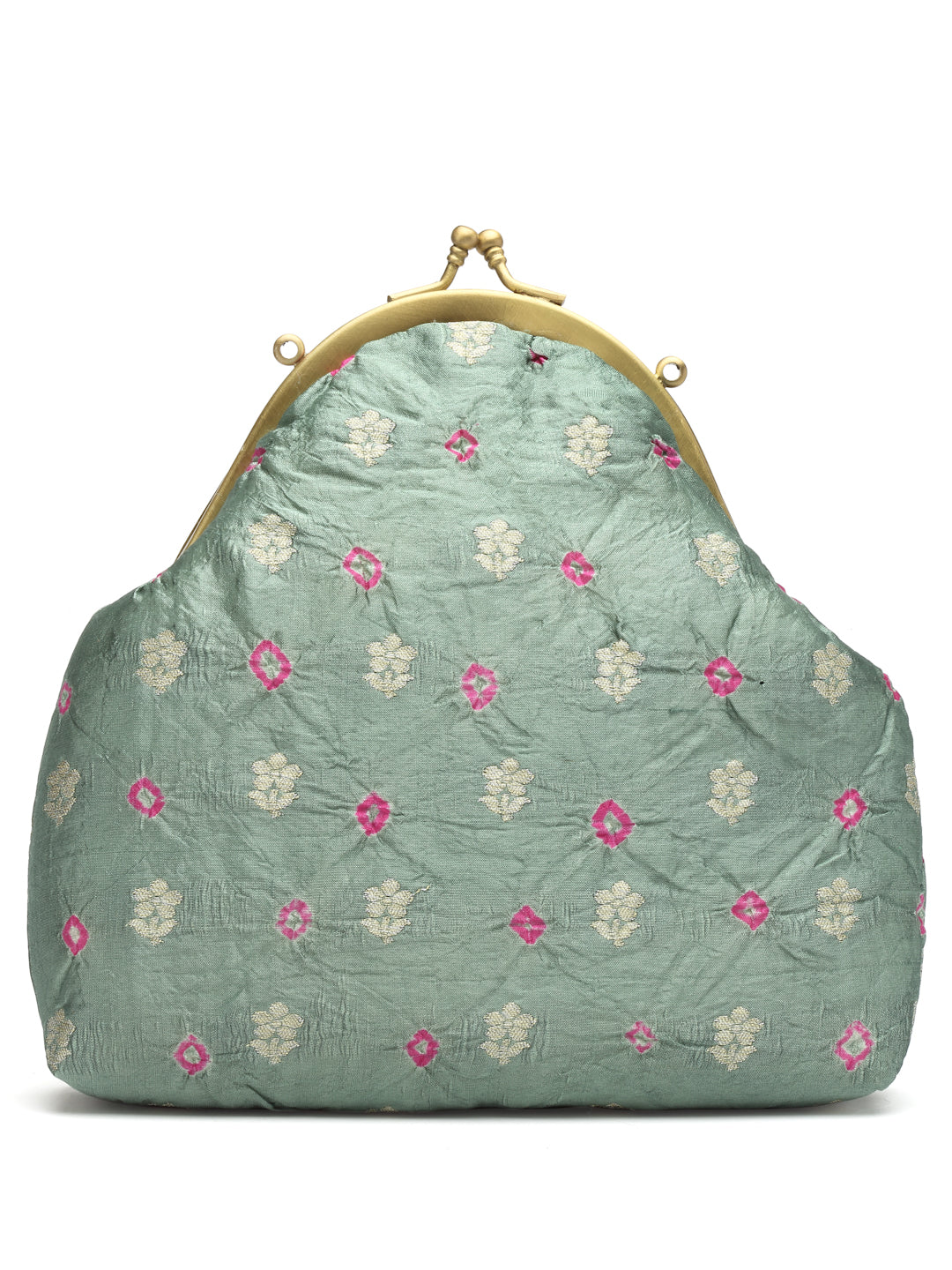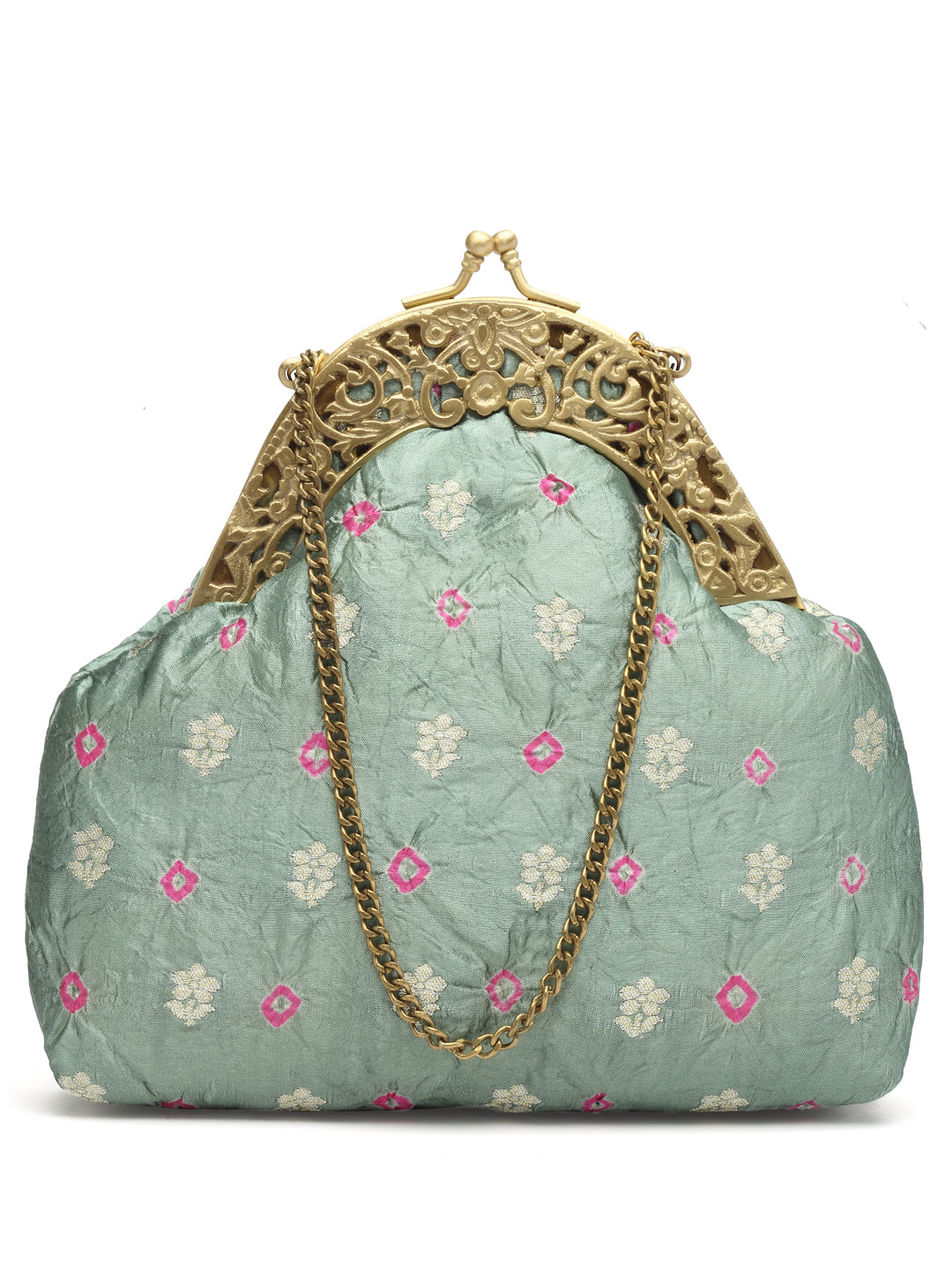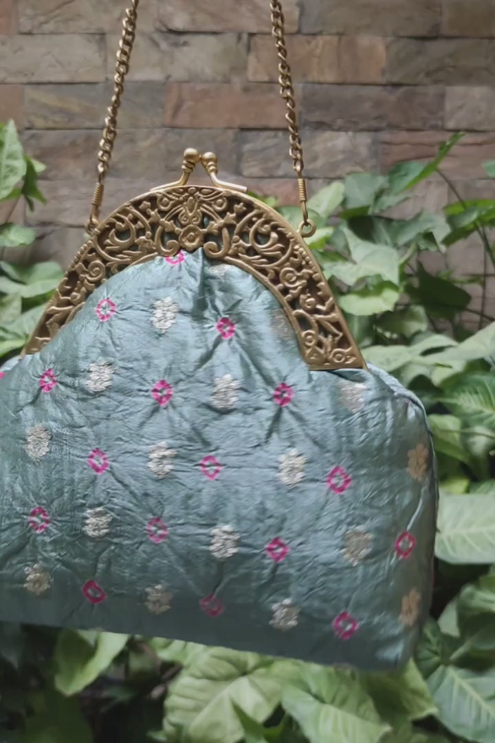 Silk brocade tie and dye stitched on an antique kiss lock Half frame. It has a detachable chain handle.