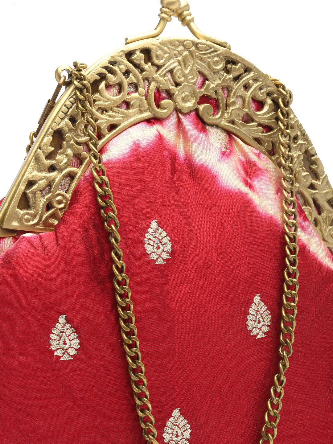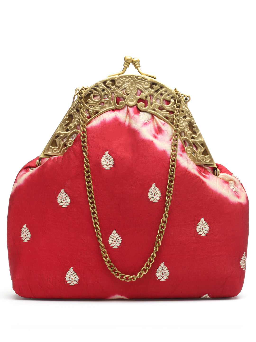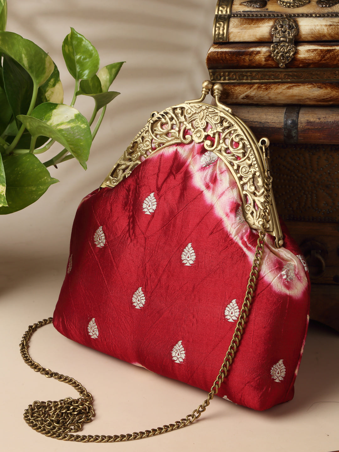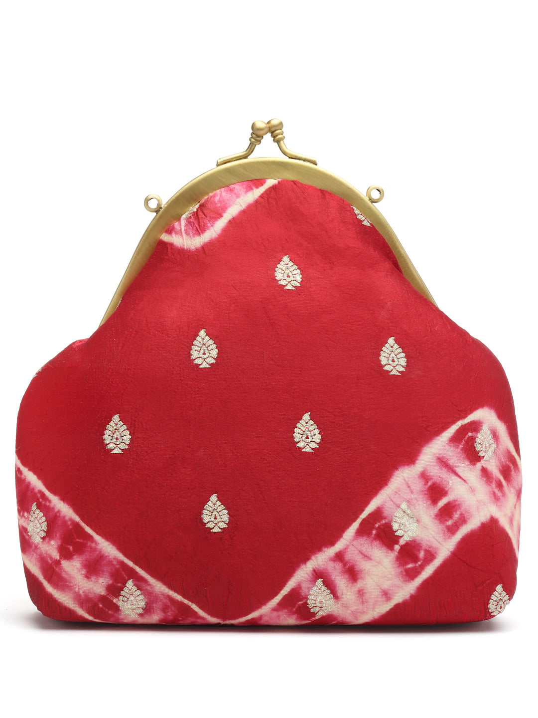 Silk Bandhej stitched on an antique kiss lock half frame. It has a detachable chain handle.