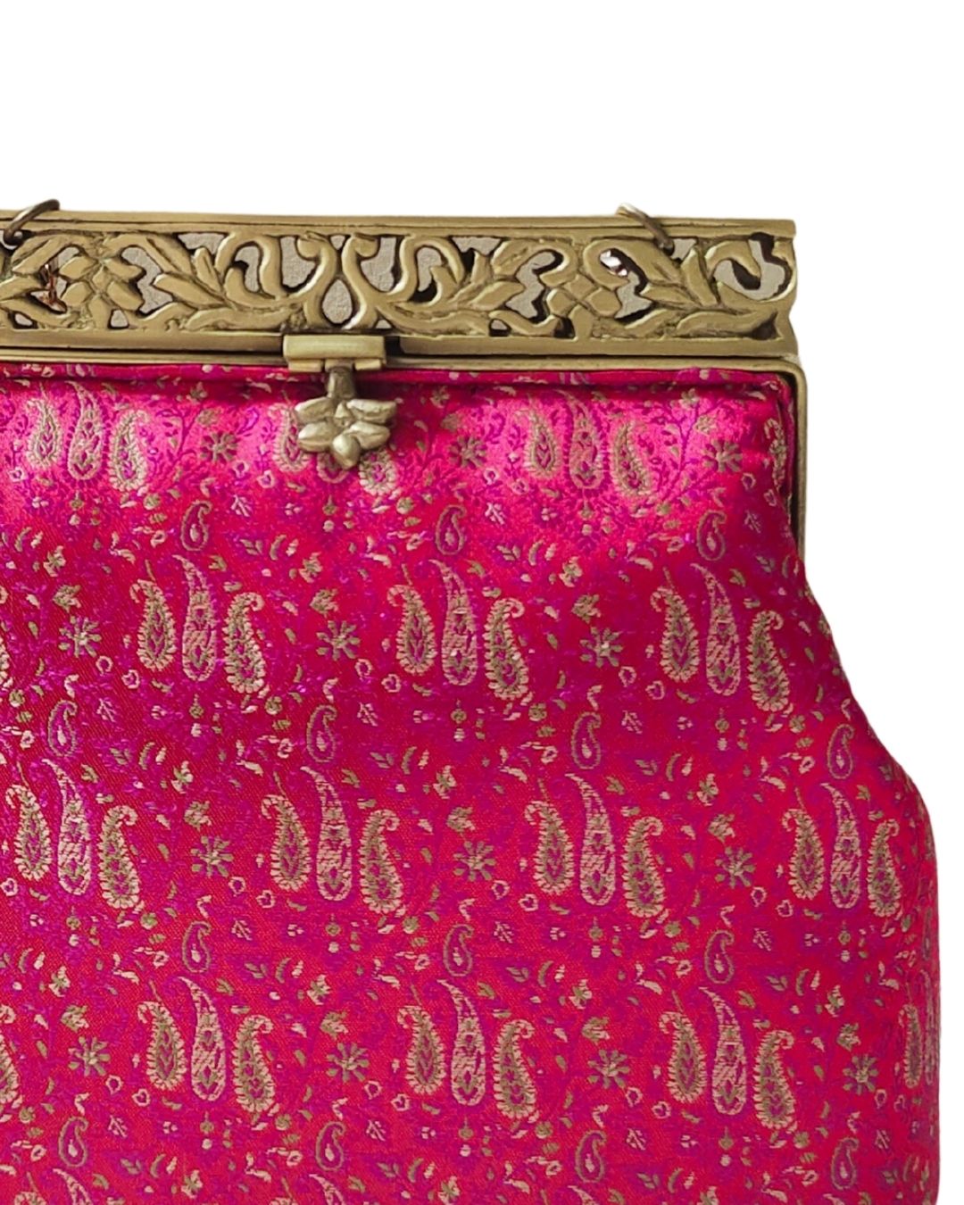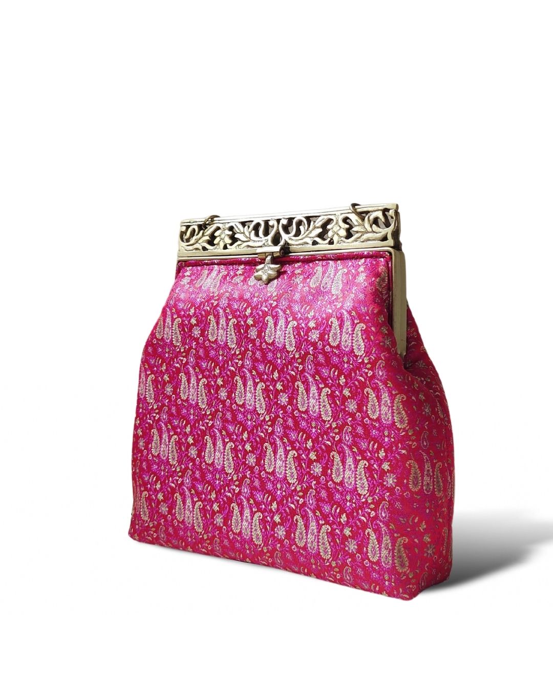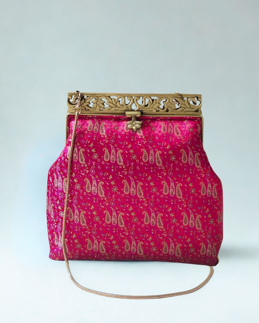Turn heads with this opulent Rani pink clutch, adorned with delicate gold zari paisley motifs woven into rich silk brocade. The ornate antique gold filigree metal frame adds a regal touch, making this clutch the epitome of festive grandeur. Whether you're attending a wedding, sangeet, or Diwali soirée, this piece promises timeless elegance.