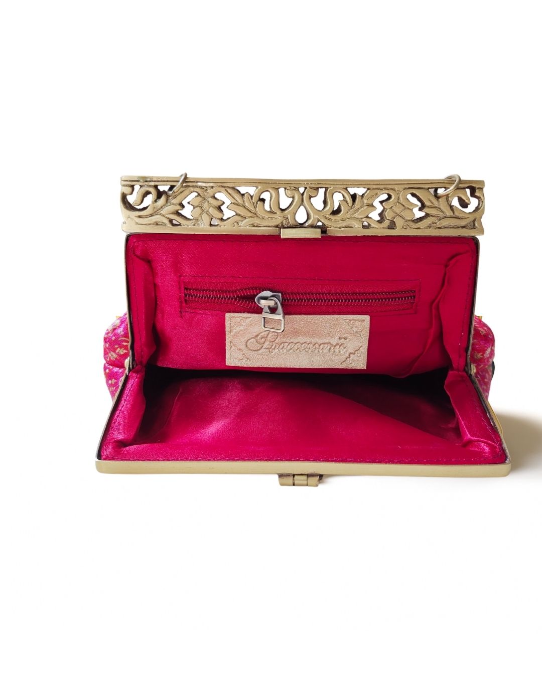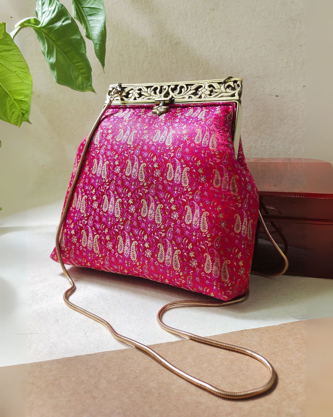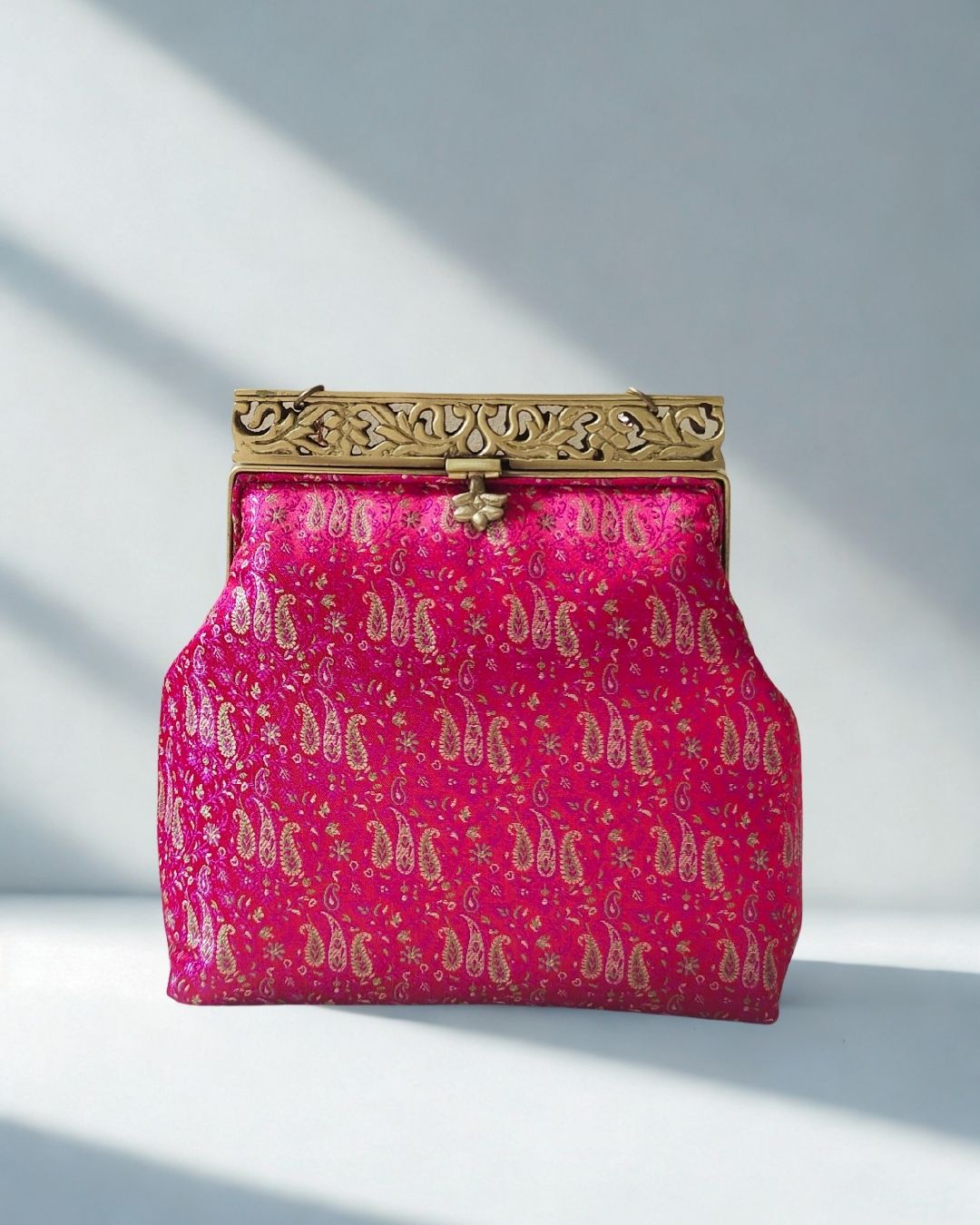 Turn heads with this opulent Rani pink clutch, adorned with delicate gold zari paisley motifs woven into rich silk brocade. The ornate antique gold filigree metal frame adds a regal touch, making this clutch the epitome of festive grandeur. Whether you're attending a wedding, sangeet, or Diwali soirée, this piece promises timeless elegance.