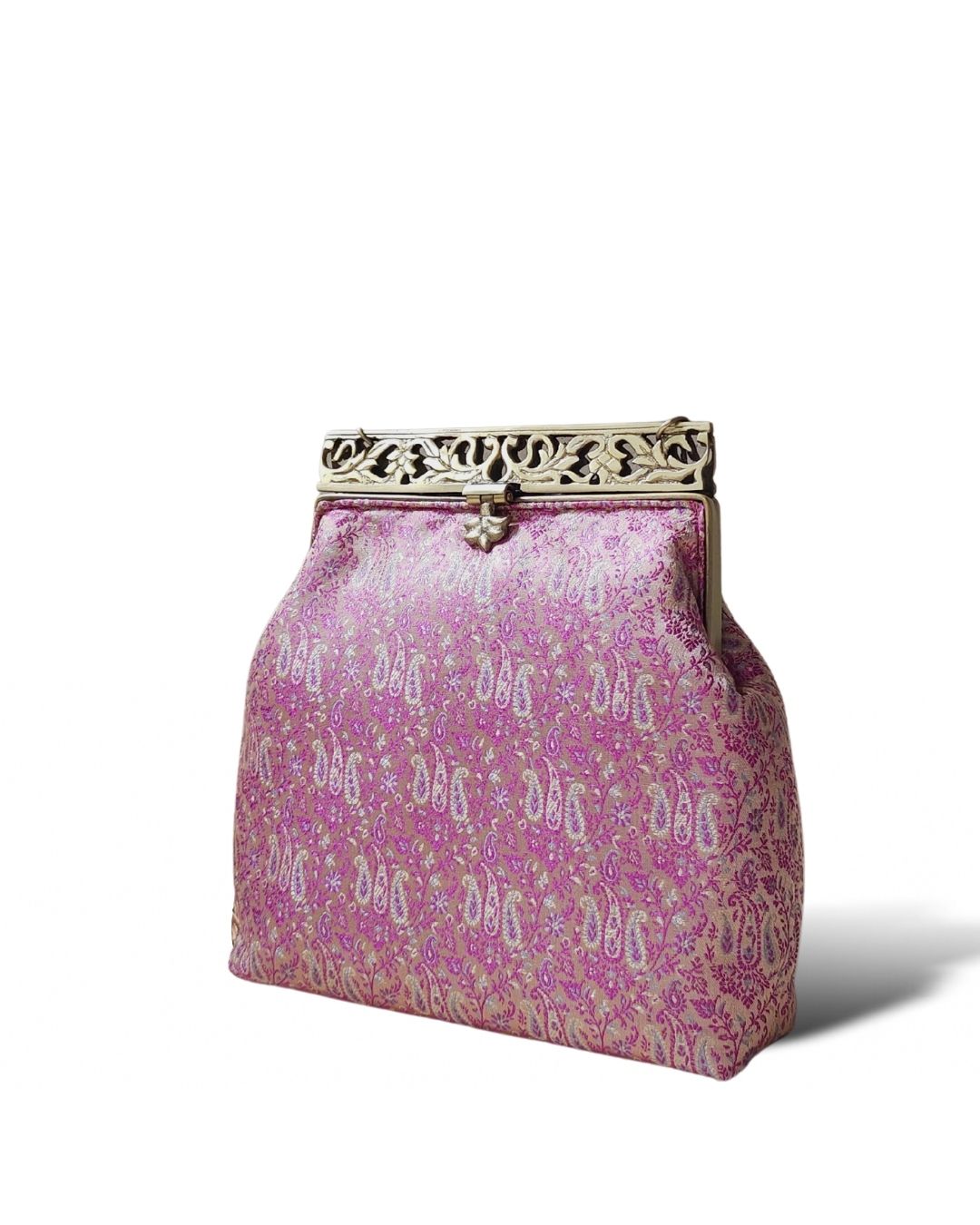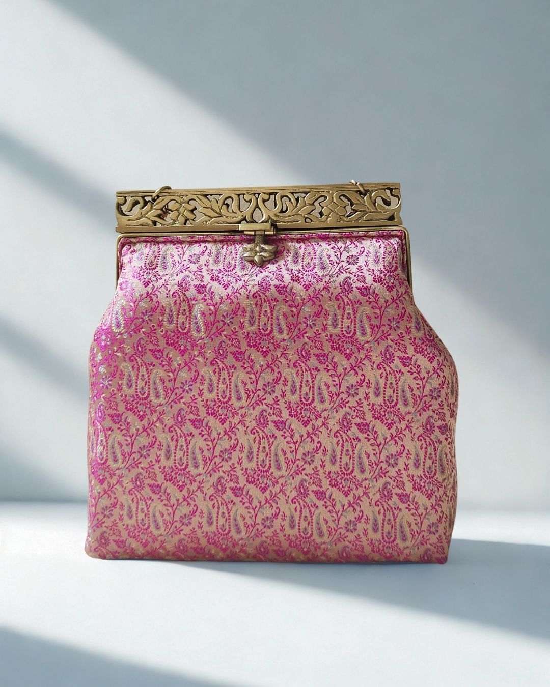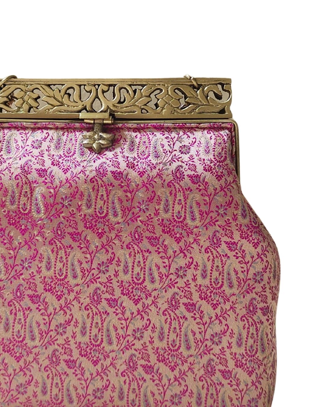 Delicate yet striking, this handcrafted clutch in a soft blush pink base with gold zari paisley motifs offers a graceful take on traditional luxury. The intricate antique-style metal frame lends a royal charm, while the subtle sheen of the silk brocade makes it a versatile accessory for day weddings, poojas, or elegant evenings.