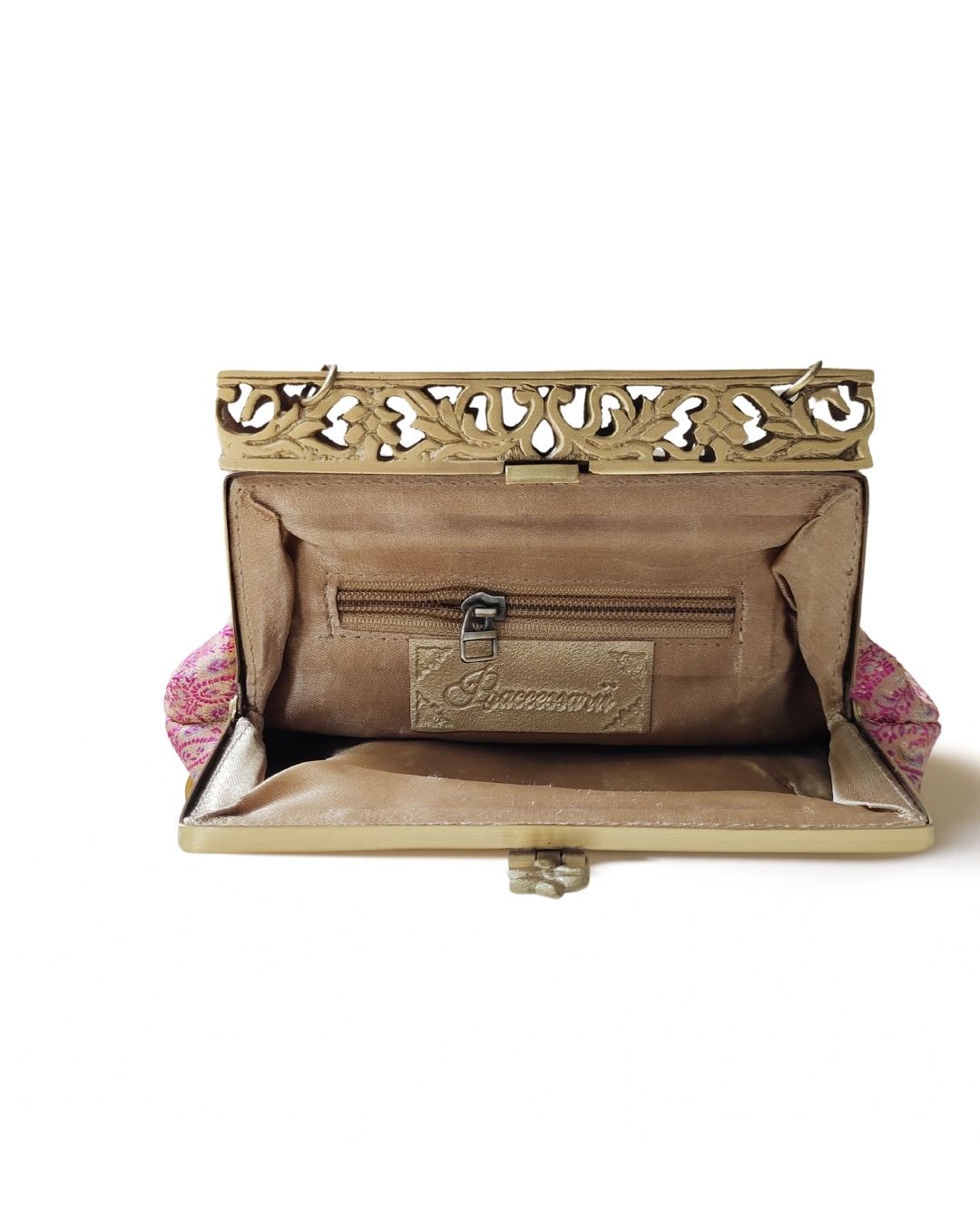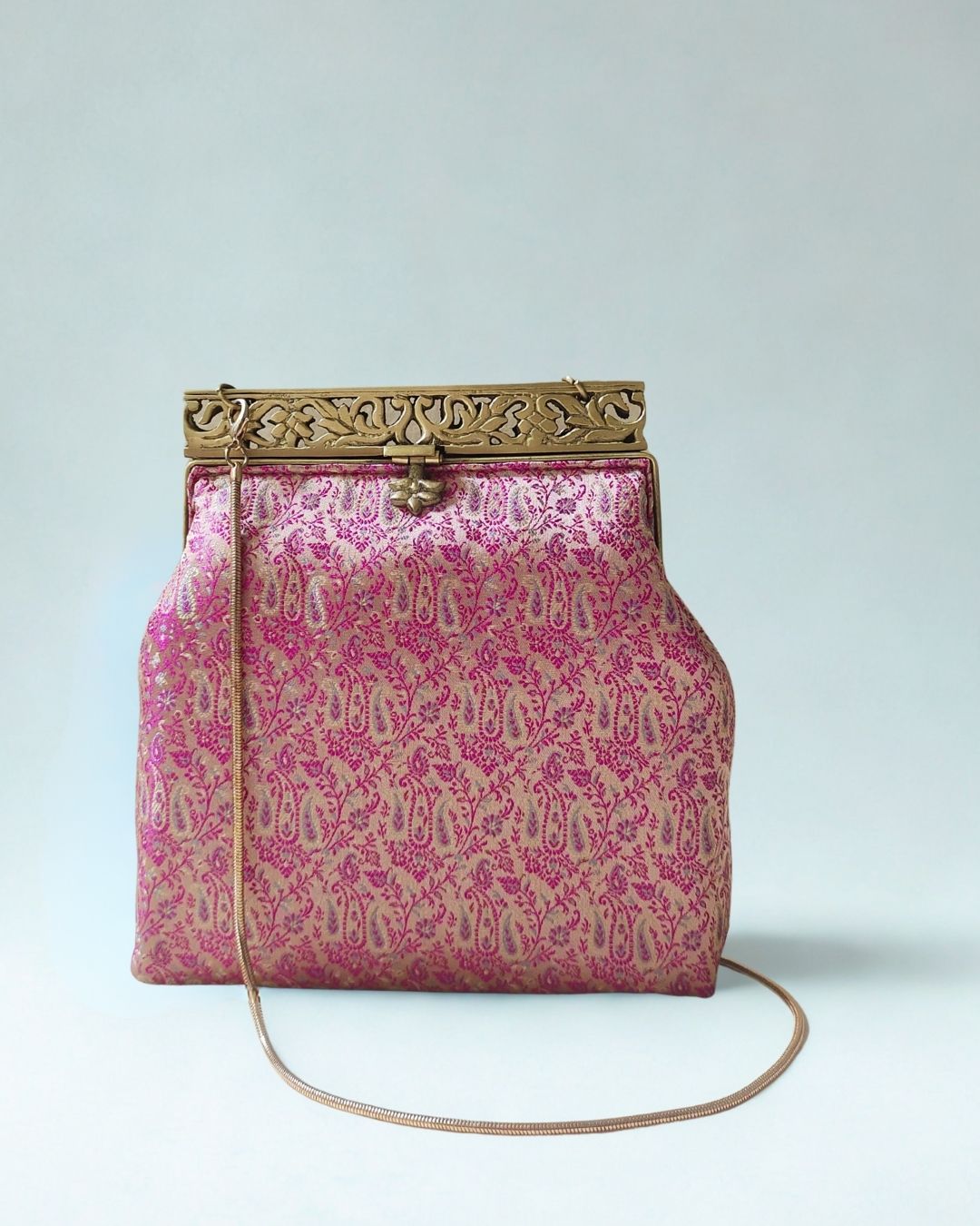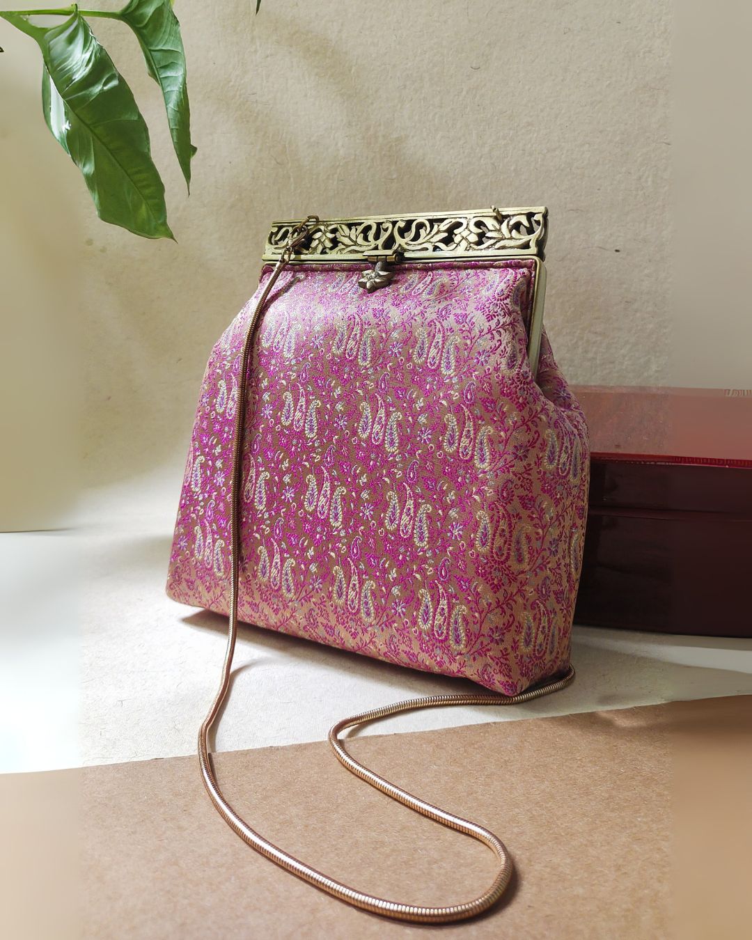 Delicate yet striking, this handcrafted clutch in a soft blush pink base with gold zari paisley motifs offers a graceful take on traditional luxury. The intricate antique-style metal frame lends a royal charm, while the subtle sheen of the silk brocade makes it a versatile accessory for day weddings, poojas, or elegant evenings.