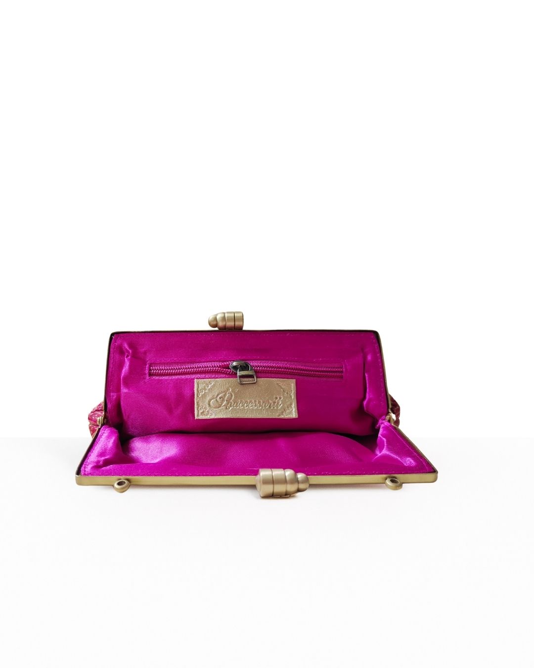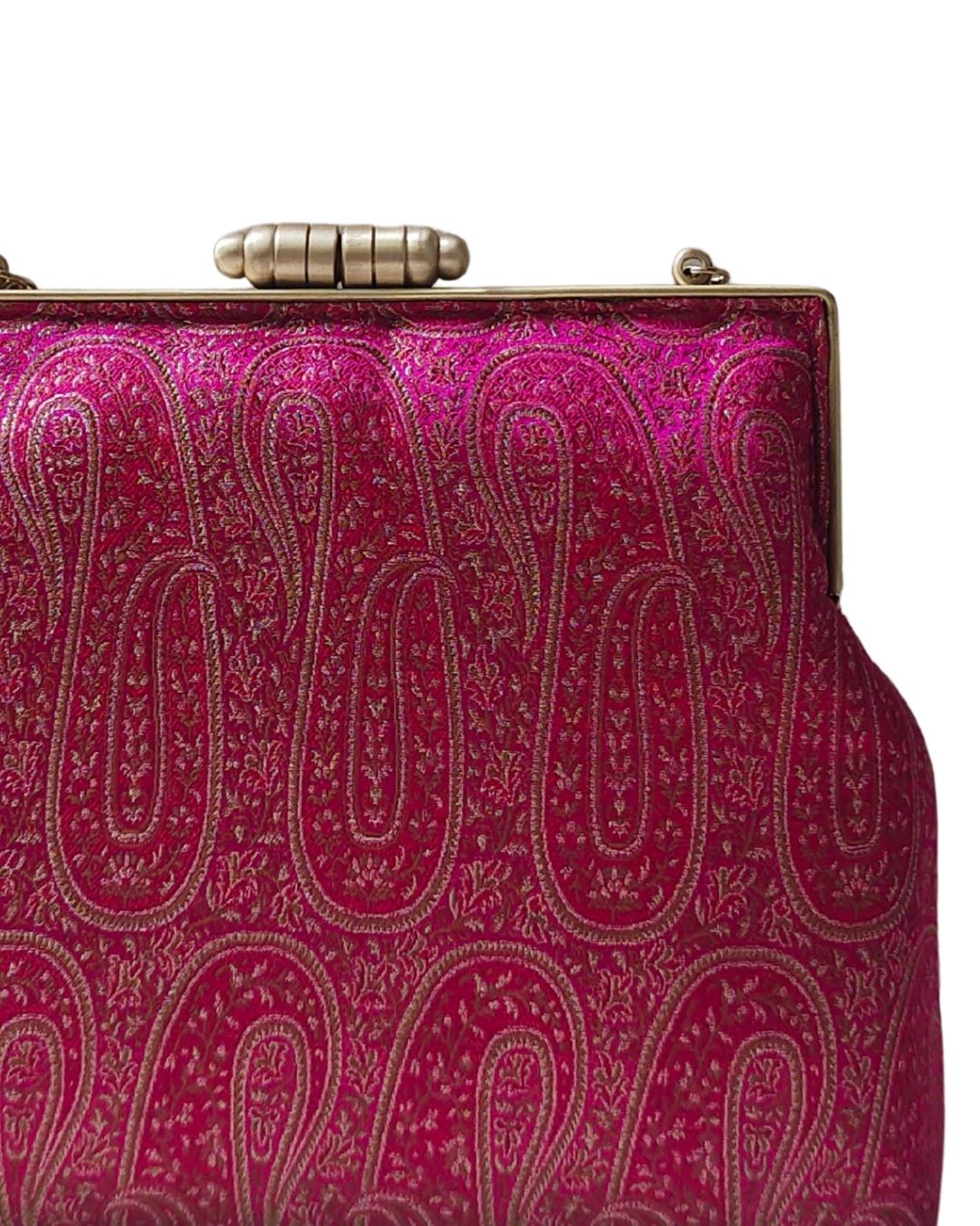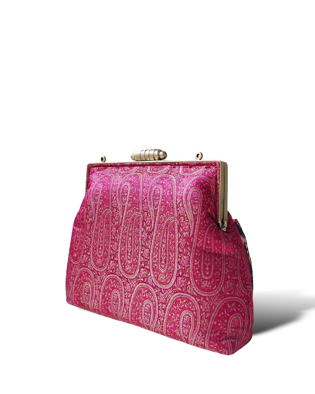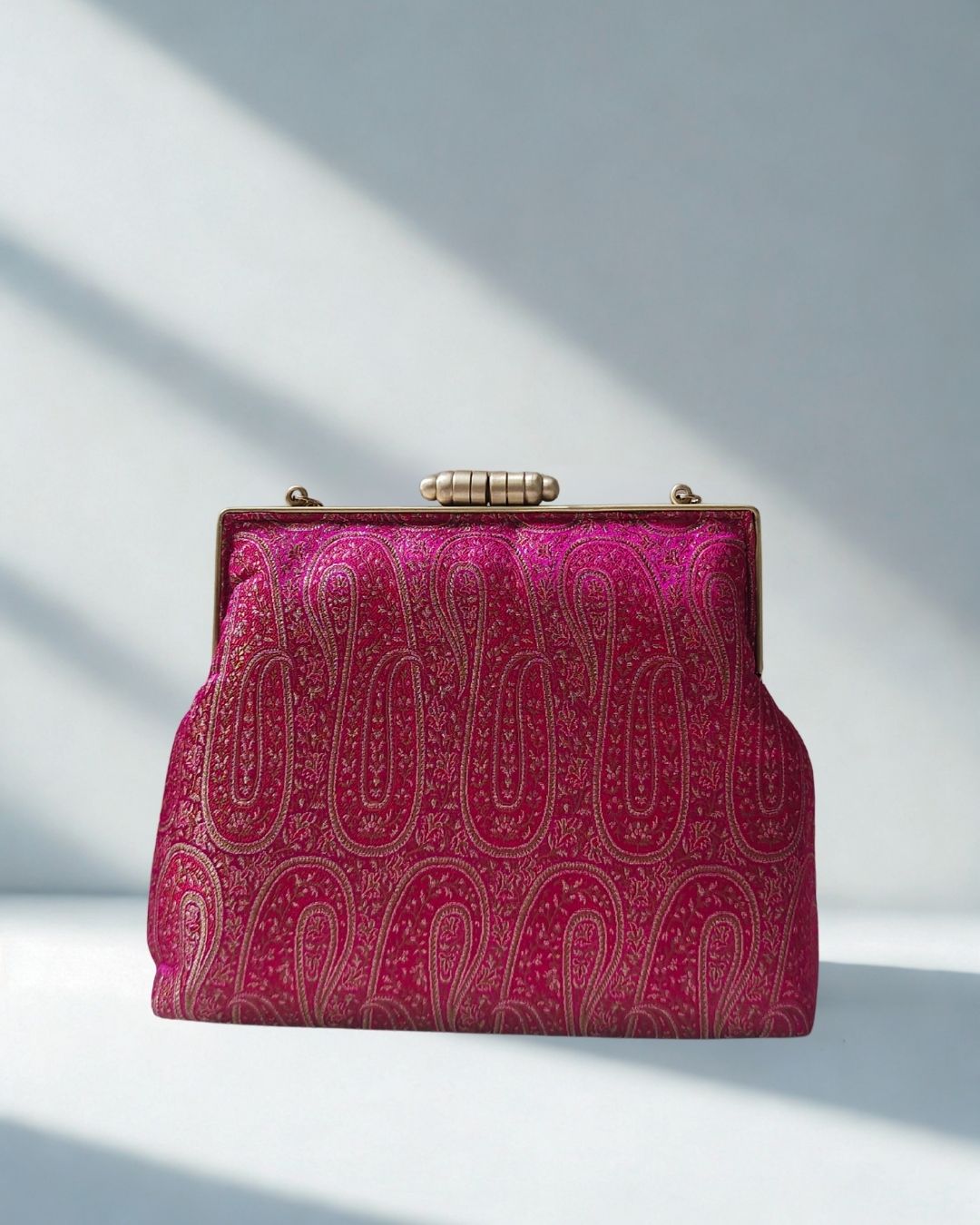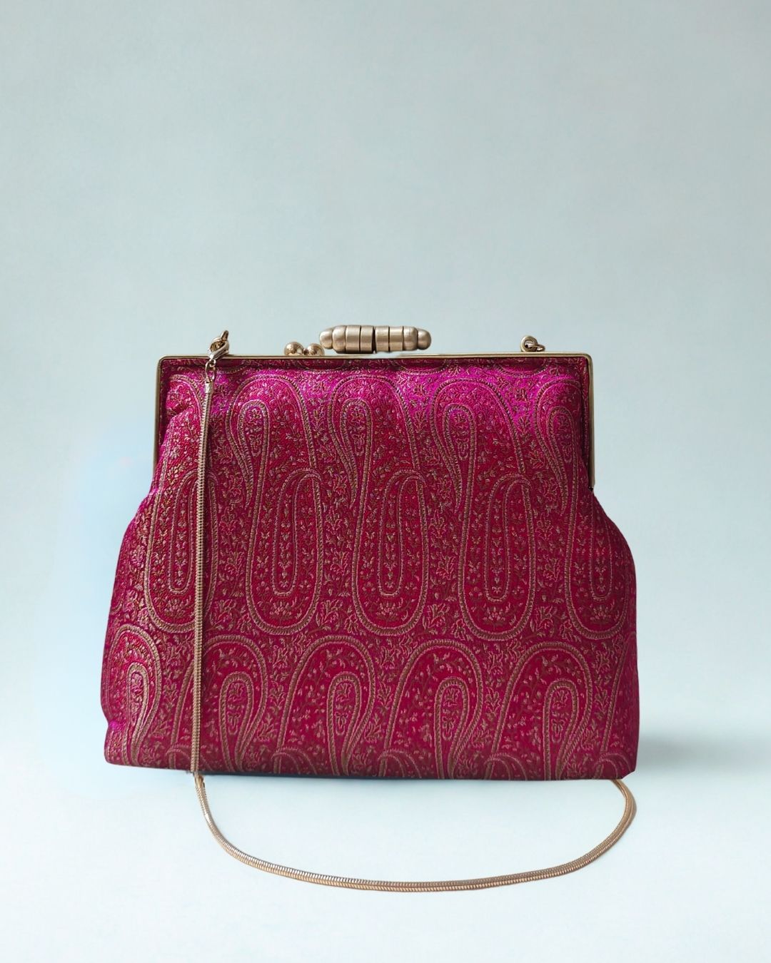 This striking clutch features a deep crimson red brocade fabric embellished with a rich golden paisley design, creating an elegant and timeless aesthetic. The structured silhouette is complemented by a classic metal clasp, adding a touch of vintage sophistication. Ideal for weddings, festive occasions, and formal gatherings, this piece beautifully merges traditional Indian textile art with refined elegance.