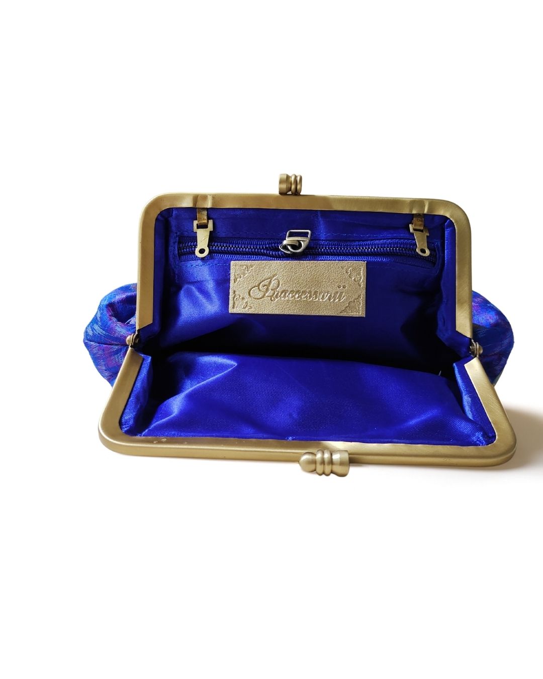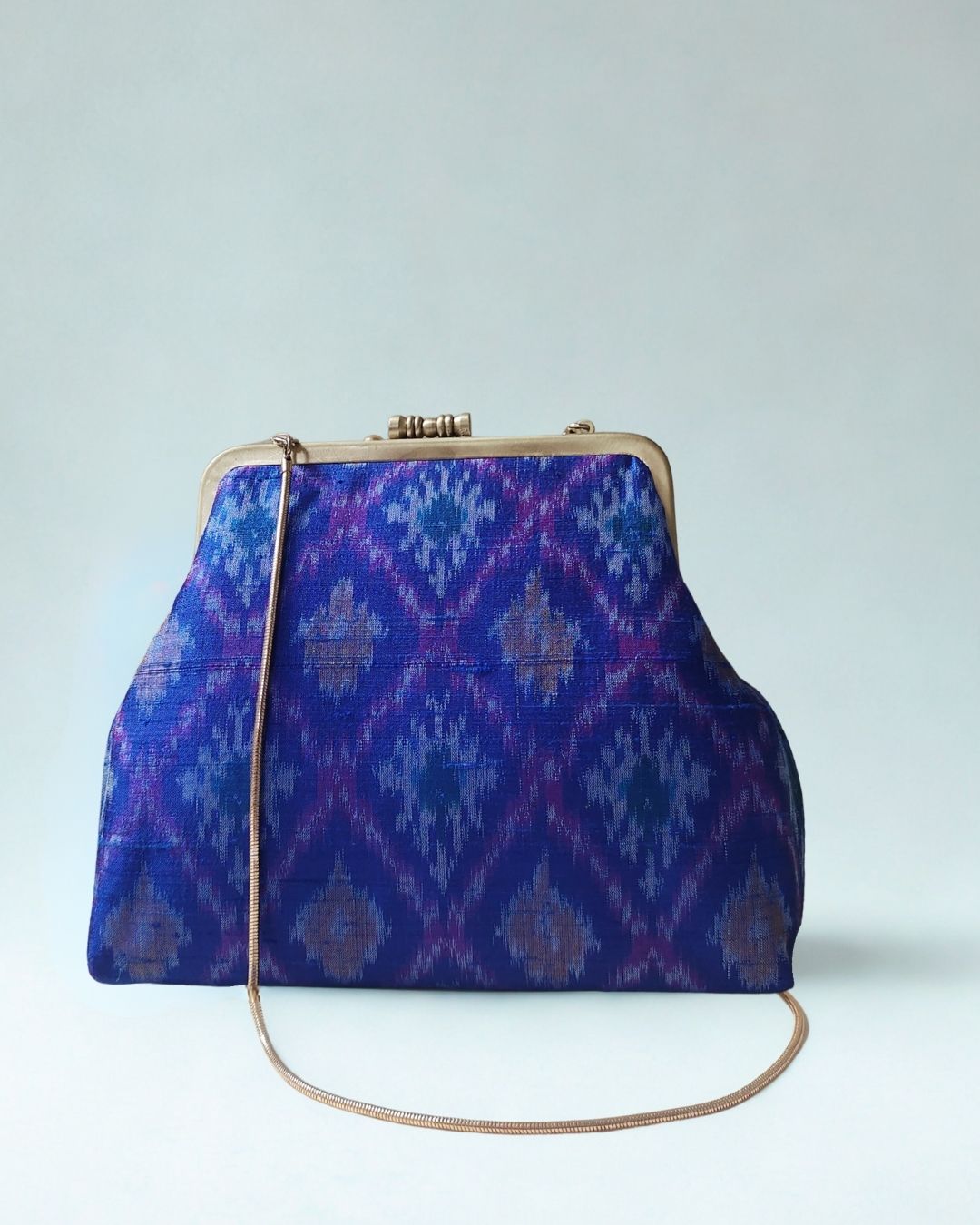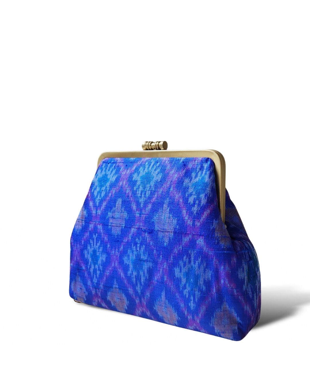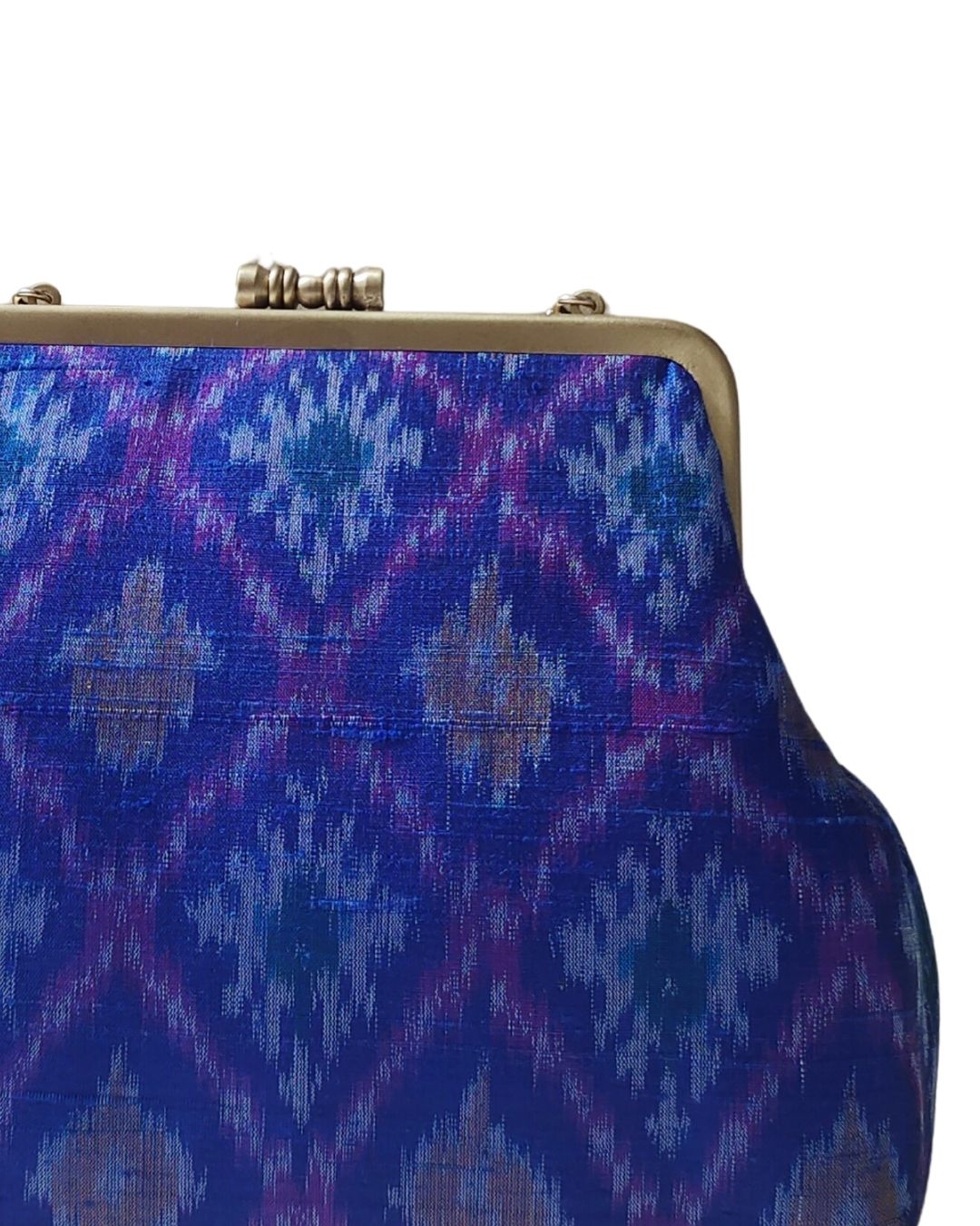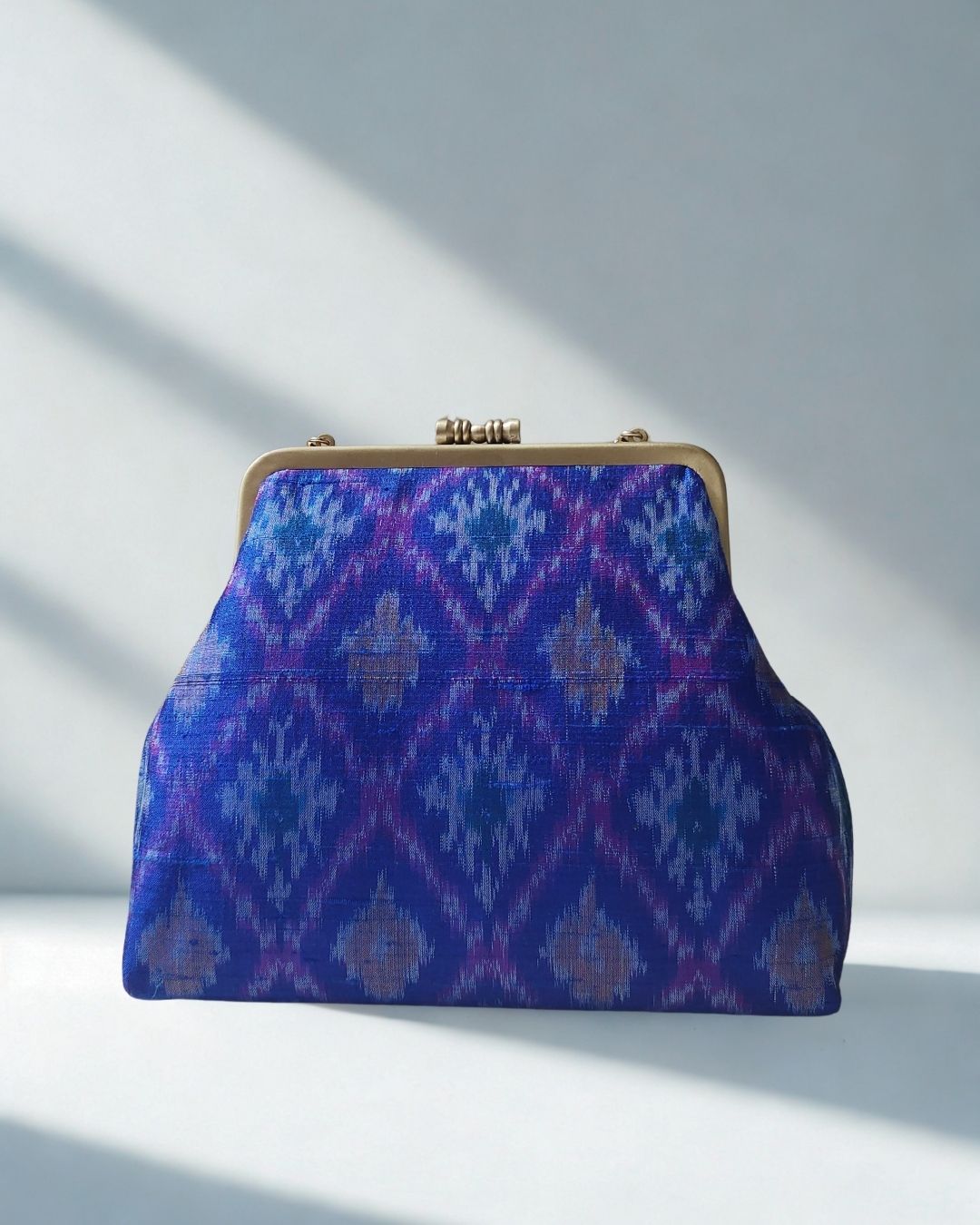 Make a statement with this striking frame clutch, handcrafted in vibrant royal blue Ikat weave. The geometric diamond patterns in shades of purple and white evoke a fusion of tradition and modernity. Finished with a sleek gold-tone metal clasp, this clutch is a versatile piece that transitions effortlessly from day to evening wear.