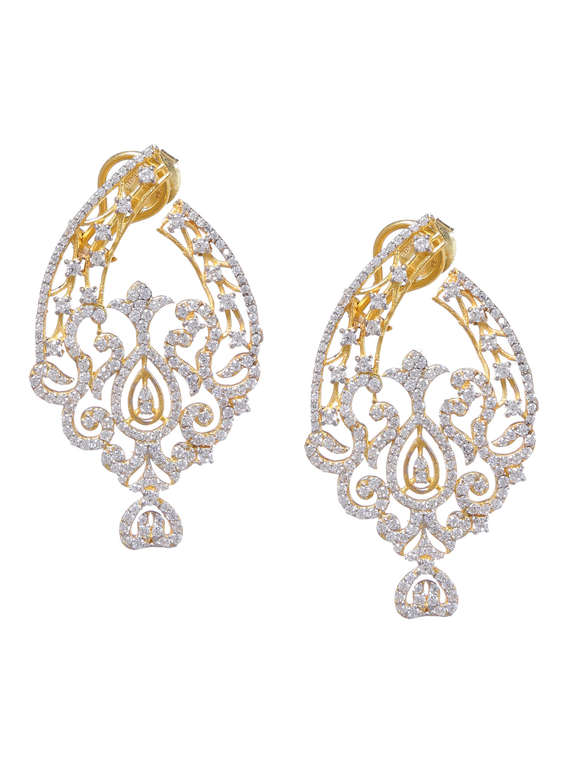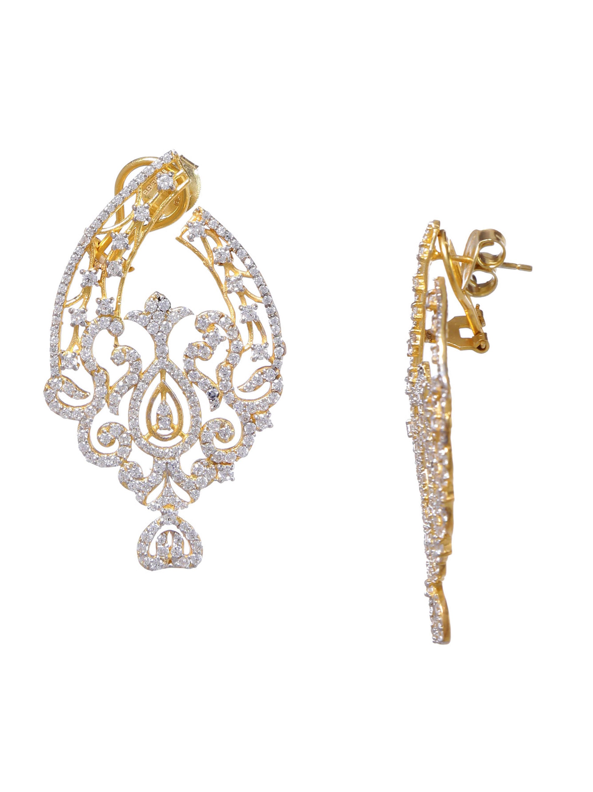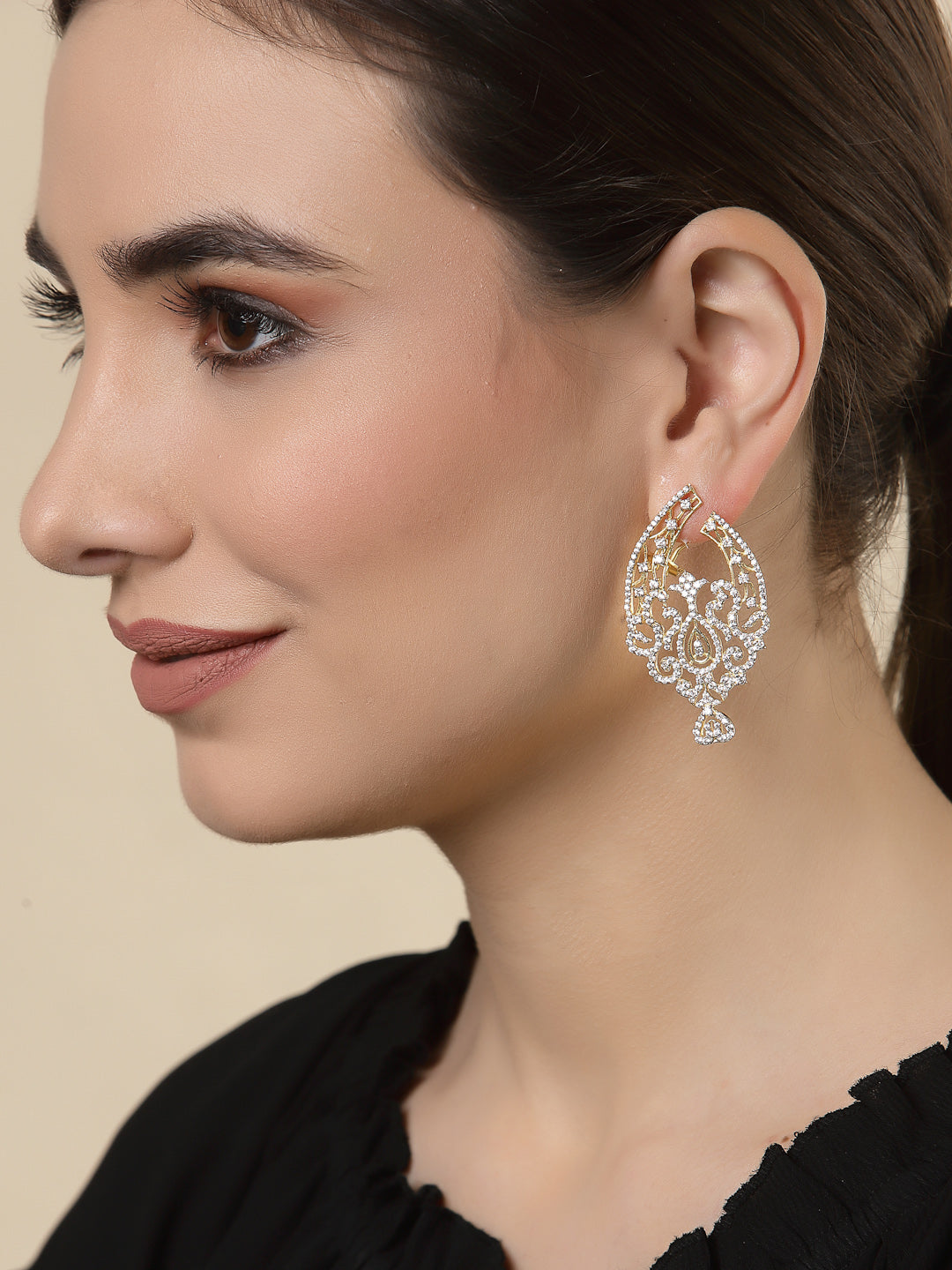 Intricately designed two toned ear pendants with pave set cubic zirconia in sterling silver.Push back closure.