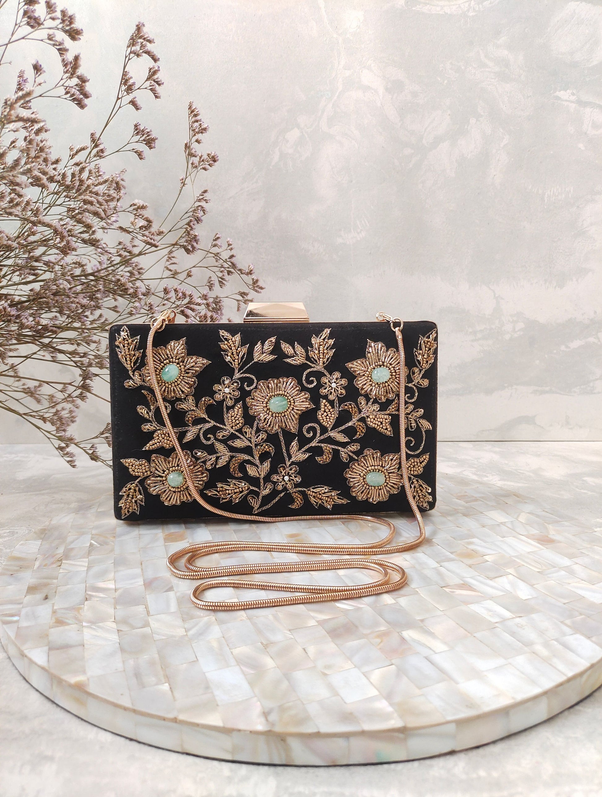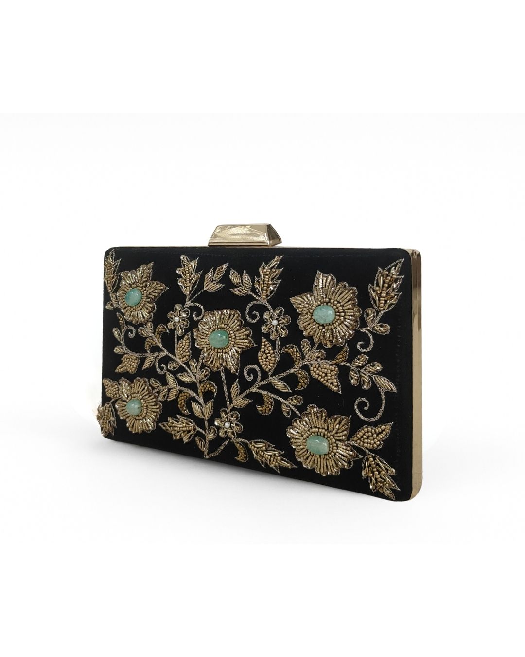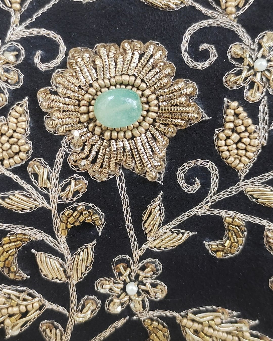 Exquisite black suede clutch richly embellished with golden floral embroidery and highlighed with green semi-precious stones at the flower centers. The blend of suede texture, metallic threadwork and stone detailing creates a luxurious and timeless design-ideal for festive evenings, weddings and special occassions. Material: Premium Suede with Hand Embroidery