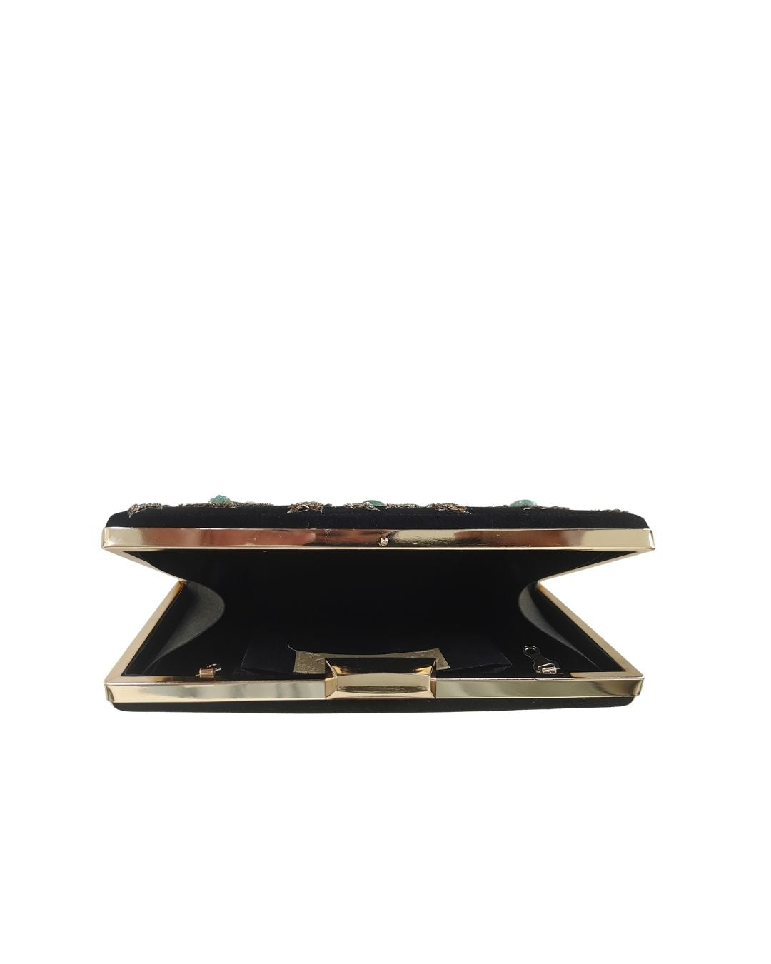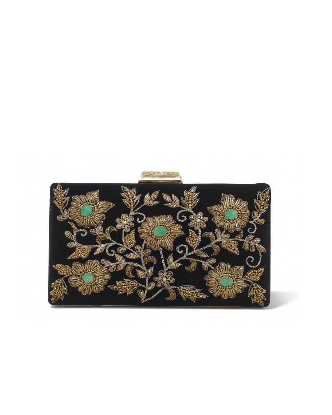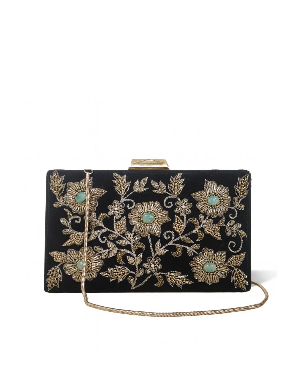 Exquisite black suede clutch richly embellished with golden floral embroidery and highlighed with green semi-precious stones at the flower centers. The blend of suede texture, metallic threadwork and stone detailing creates a luxurious and timeless design-ideal for festive evenings, weddings and special occassions. Material: Premium Suede with Hand Embroidery