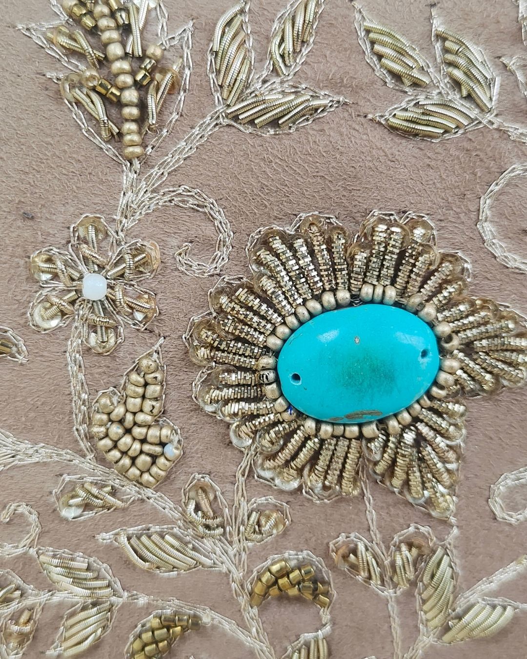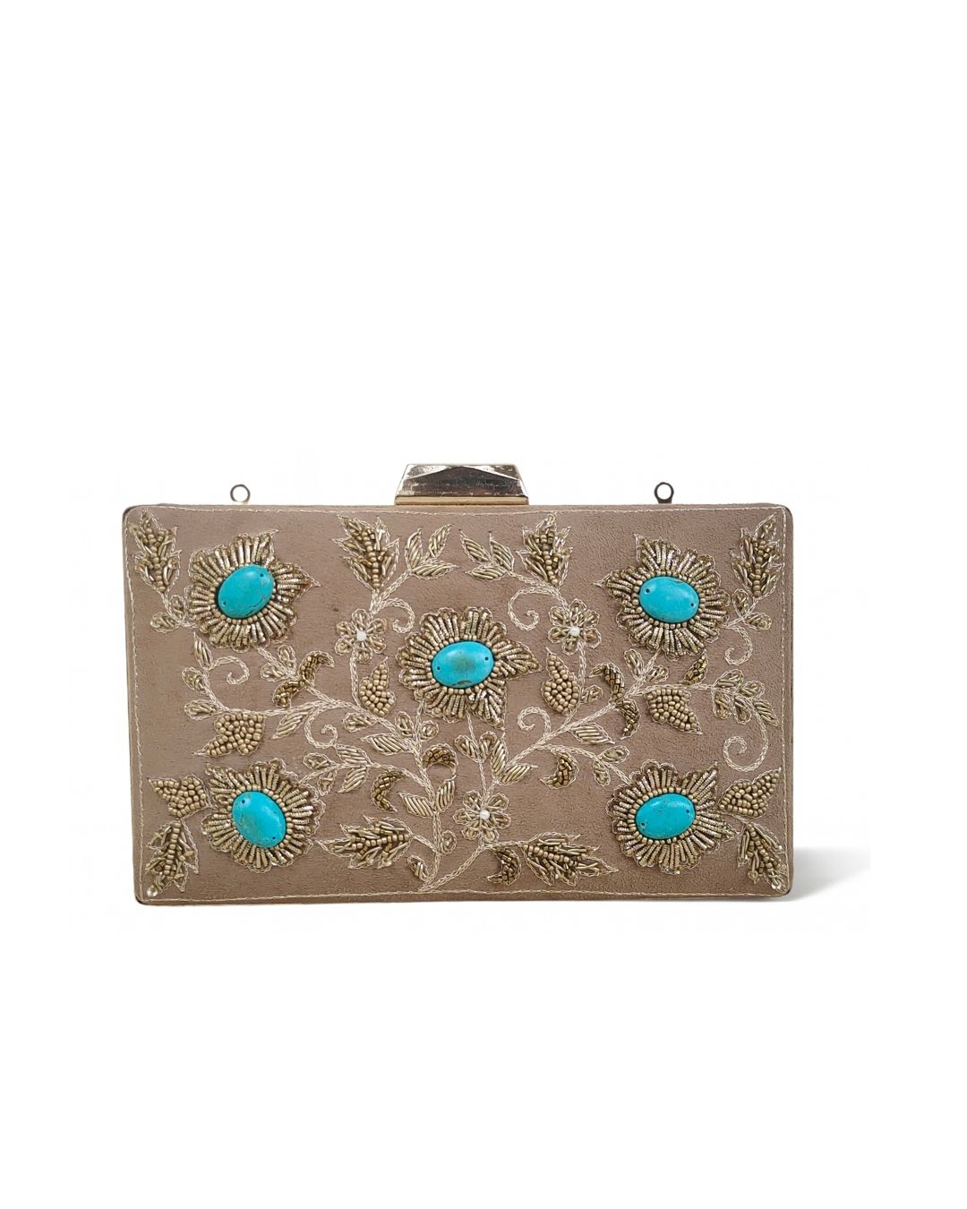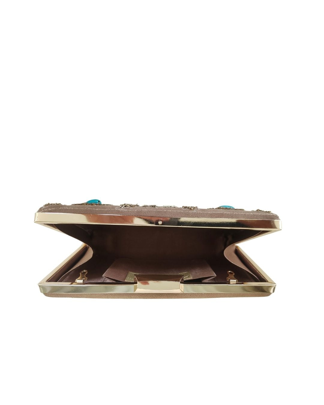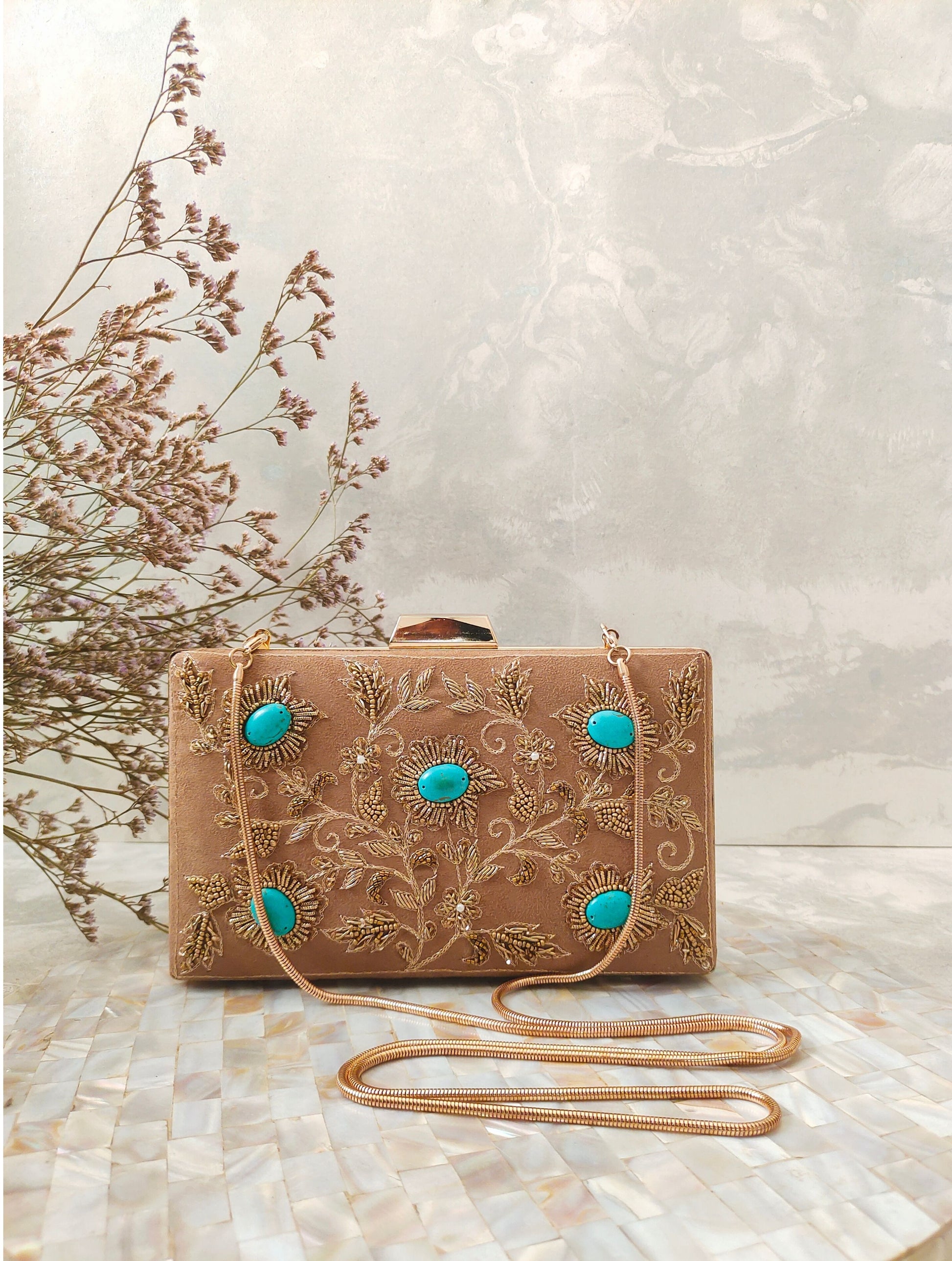 Elevate your festive look with this luxurious Beige Brown Suede clutch, beautifully adorned with intricate golden embroidery in floral and vine patterns. The elegant handcrafted detailing adds a touch of sophistication, making it the perfect accessory for weddings, parties, and festive occasions.