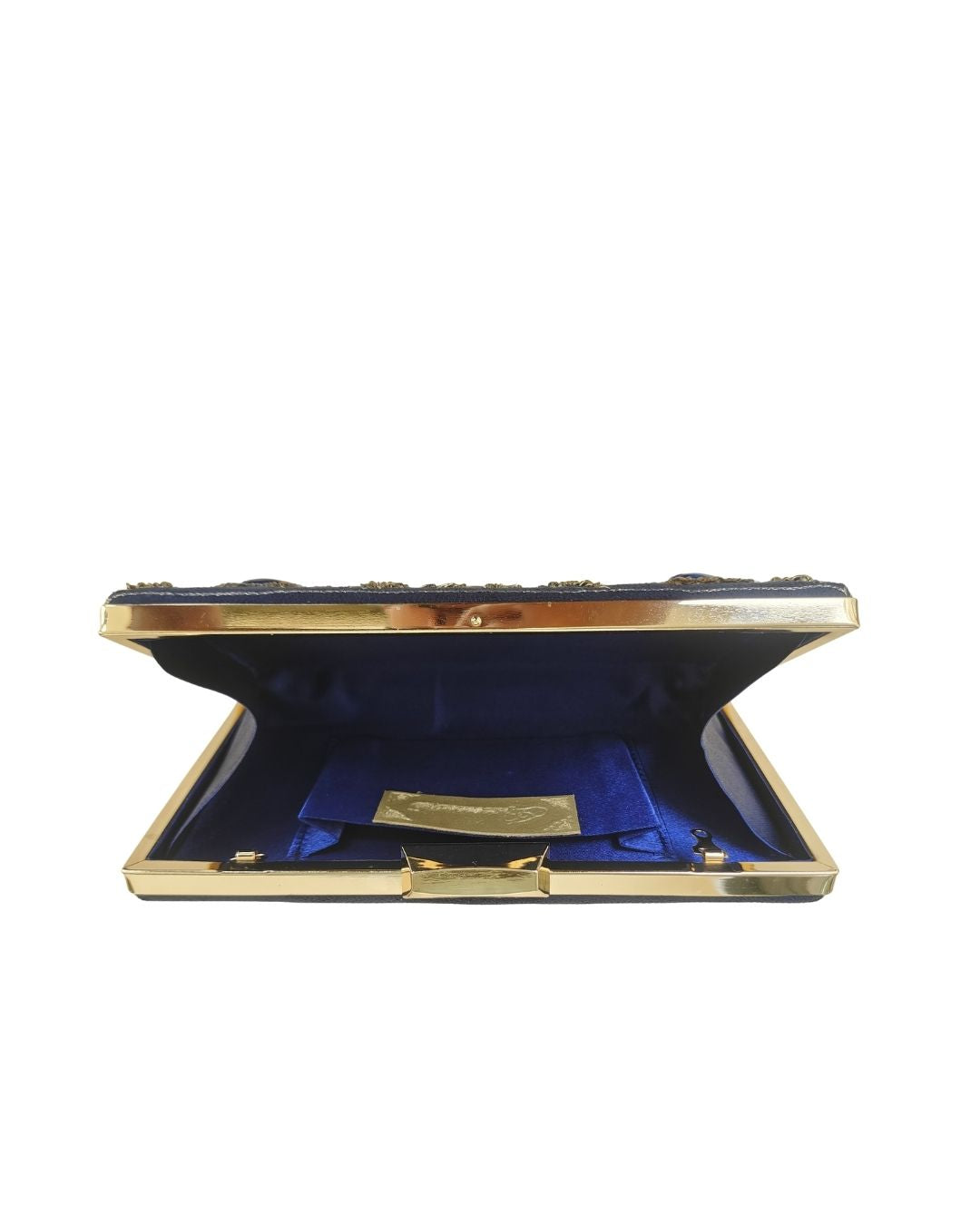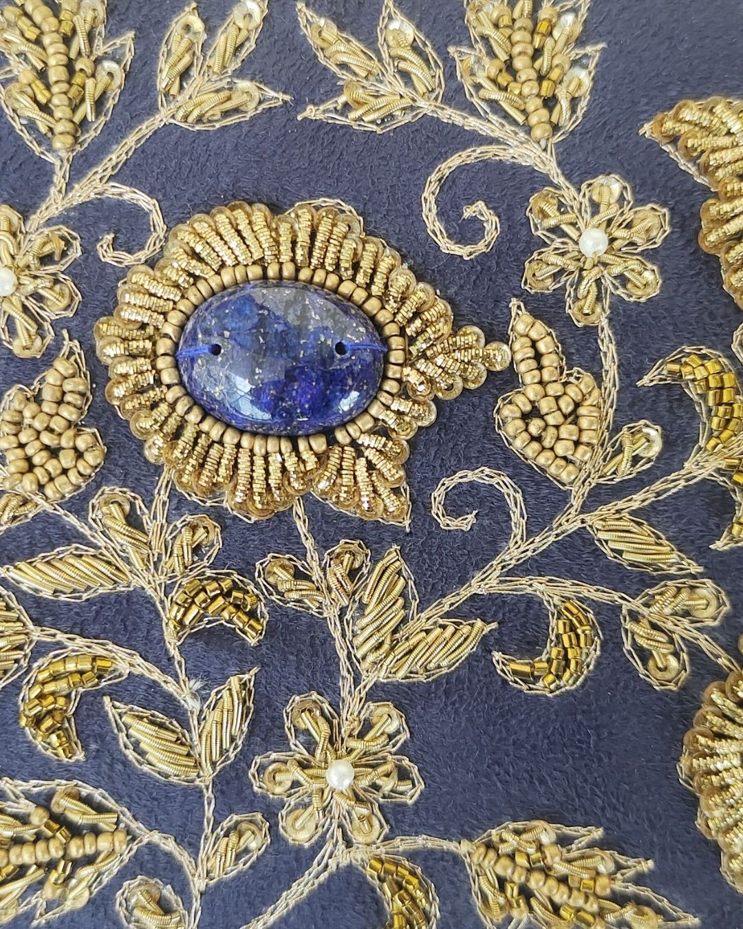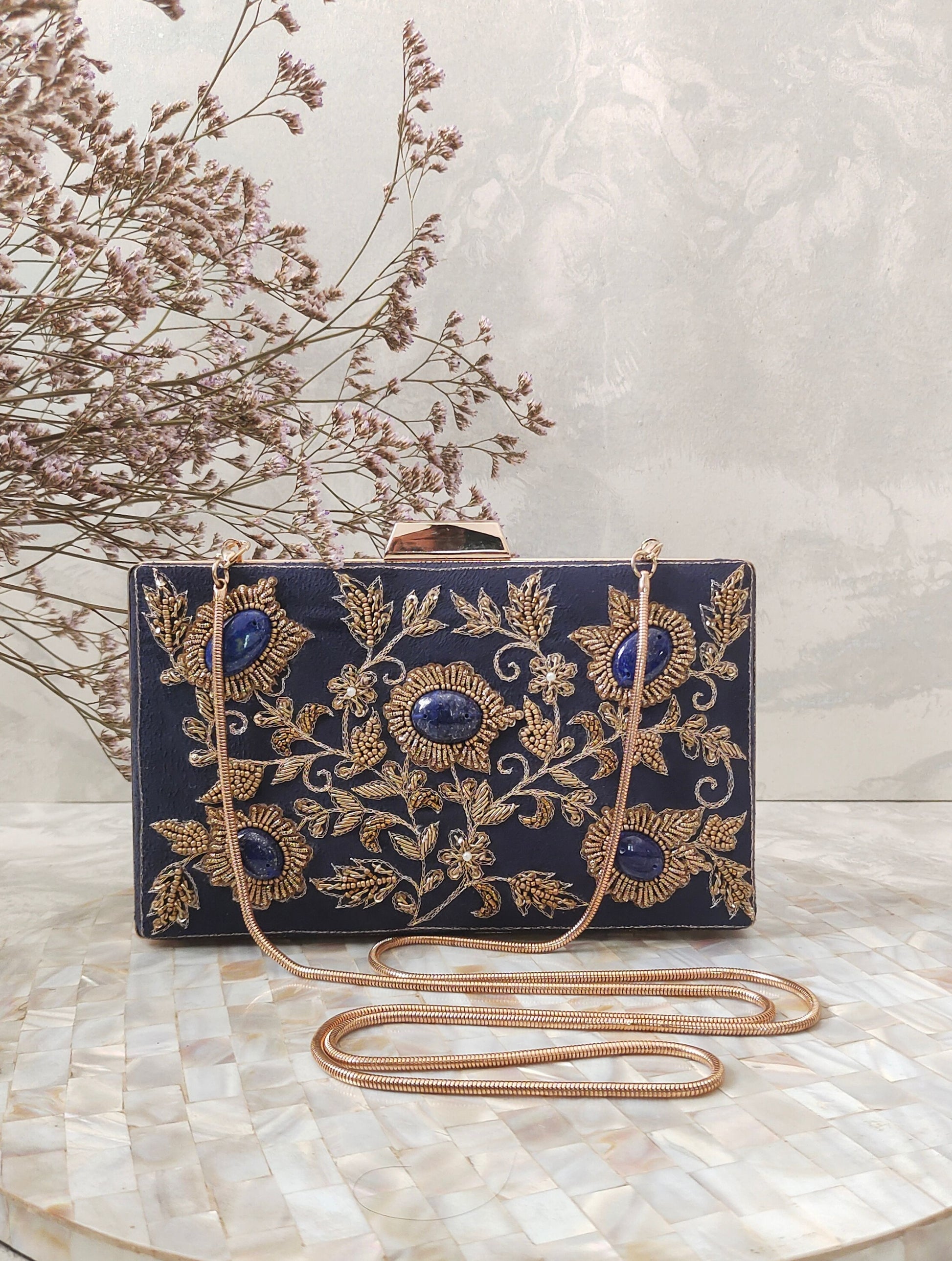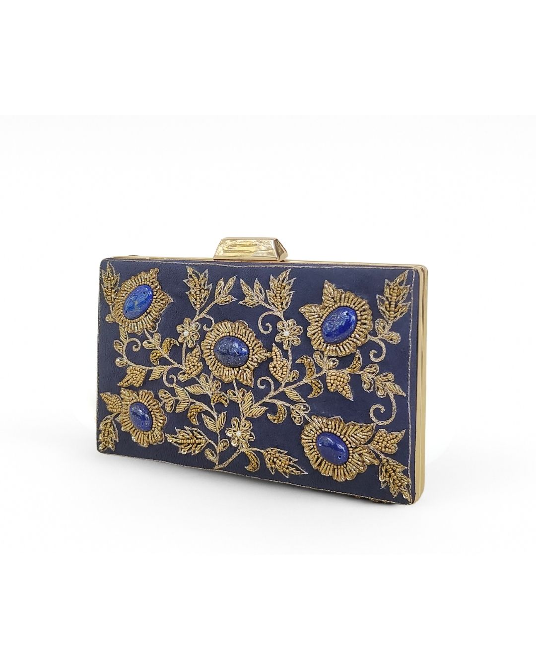 Exquisite navy blue suede clutch richly embellished with golden floral embroidery and highlighed with golden speckled lapis lazuli stones at the flower centers. The blend of suede texture, metallic threadwork and stone detailing creates a luxurious and timeless design-ideal for festive evenings, weddings and special occassions. Material: Premium Suede with Hand Embroidery