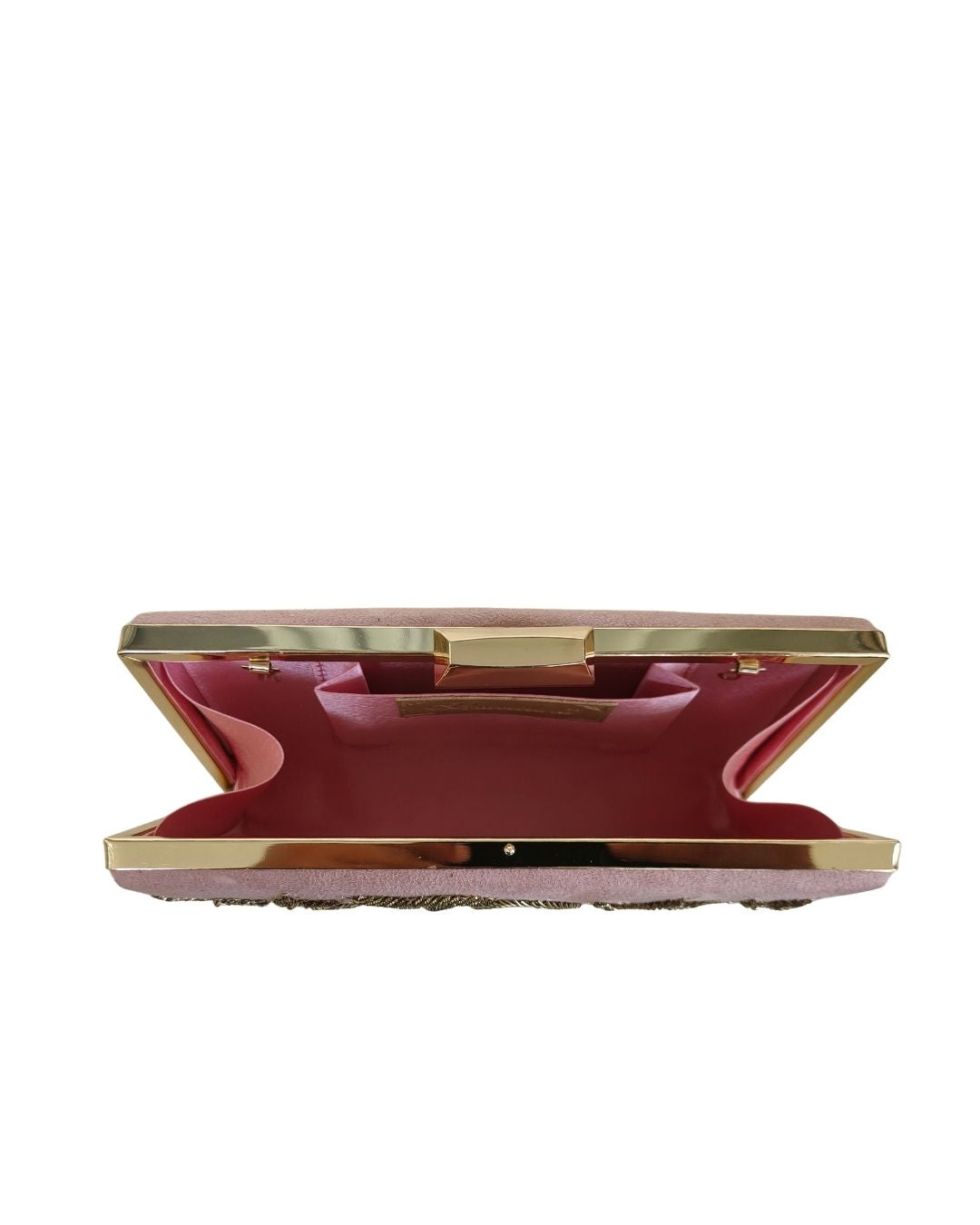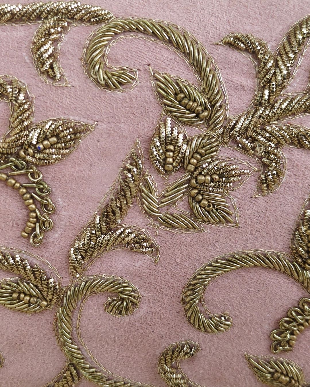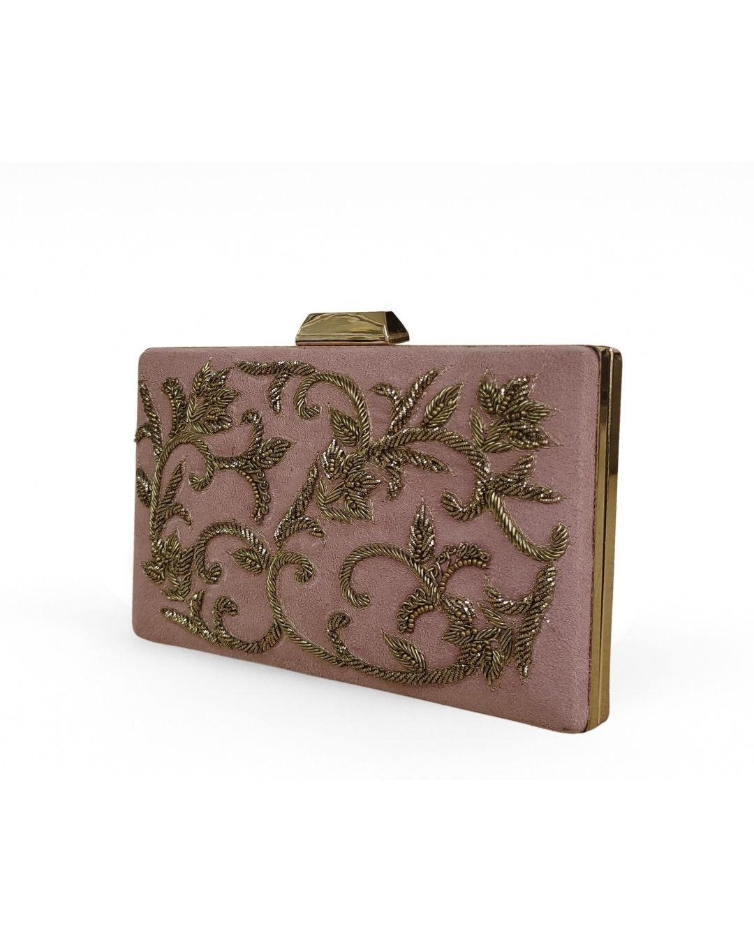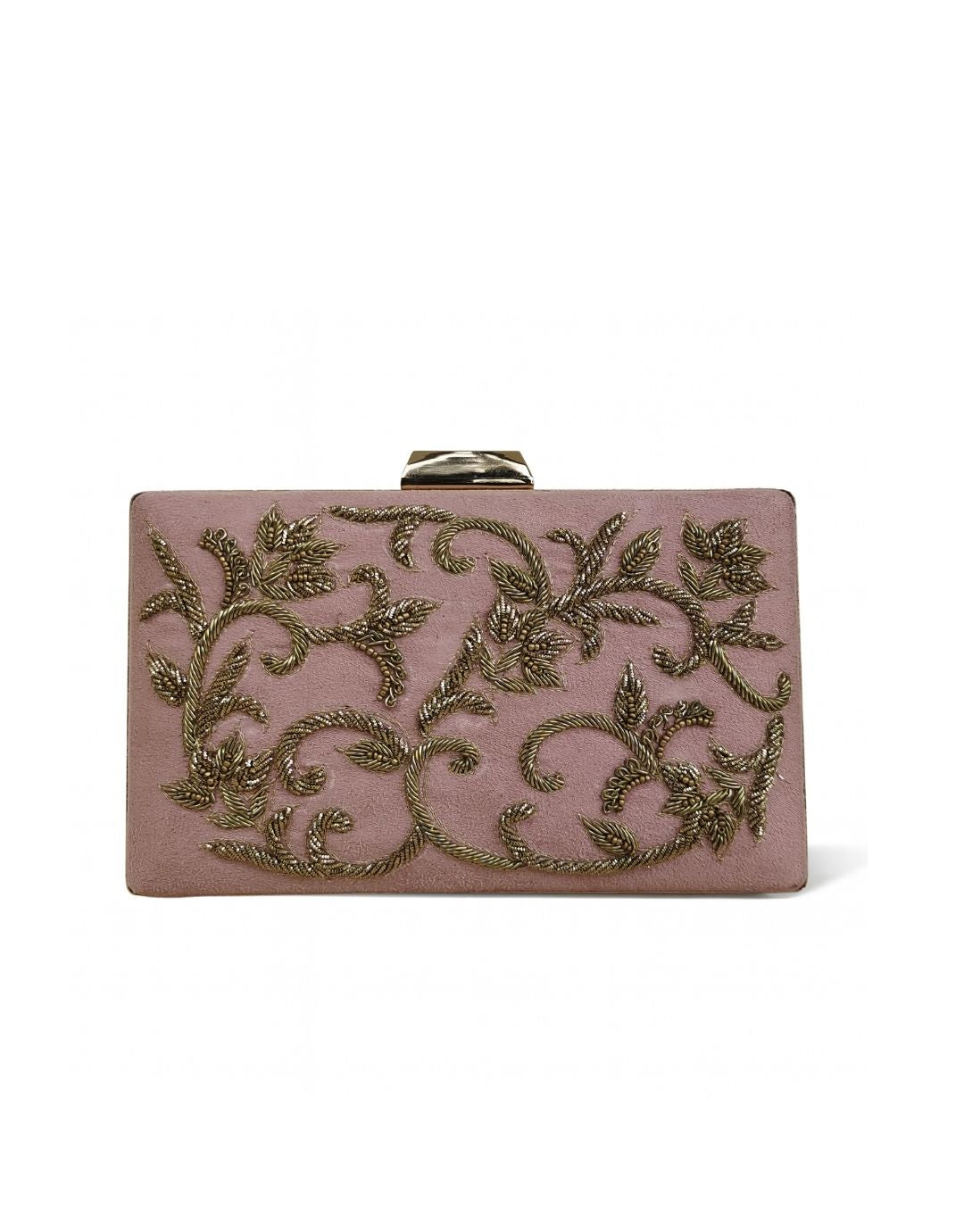 Elevate your festive look with this luxurious Dusty Pink Suede clutch, beautifully adorned with intricate golden embroidery in floral and vine patterns. The elegant handcrafted detailing adds a touch of sophistication, making it the perfect accessory for weddings, parties, and festive occasions.