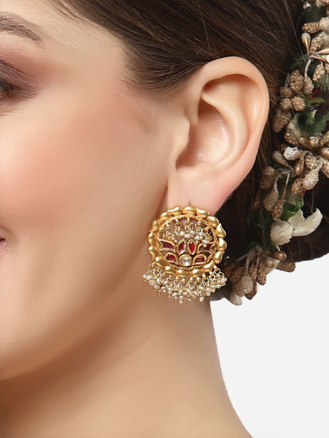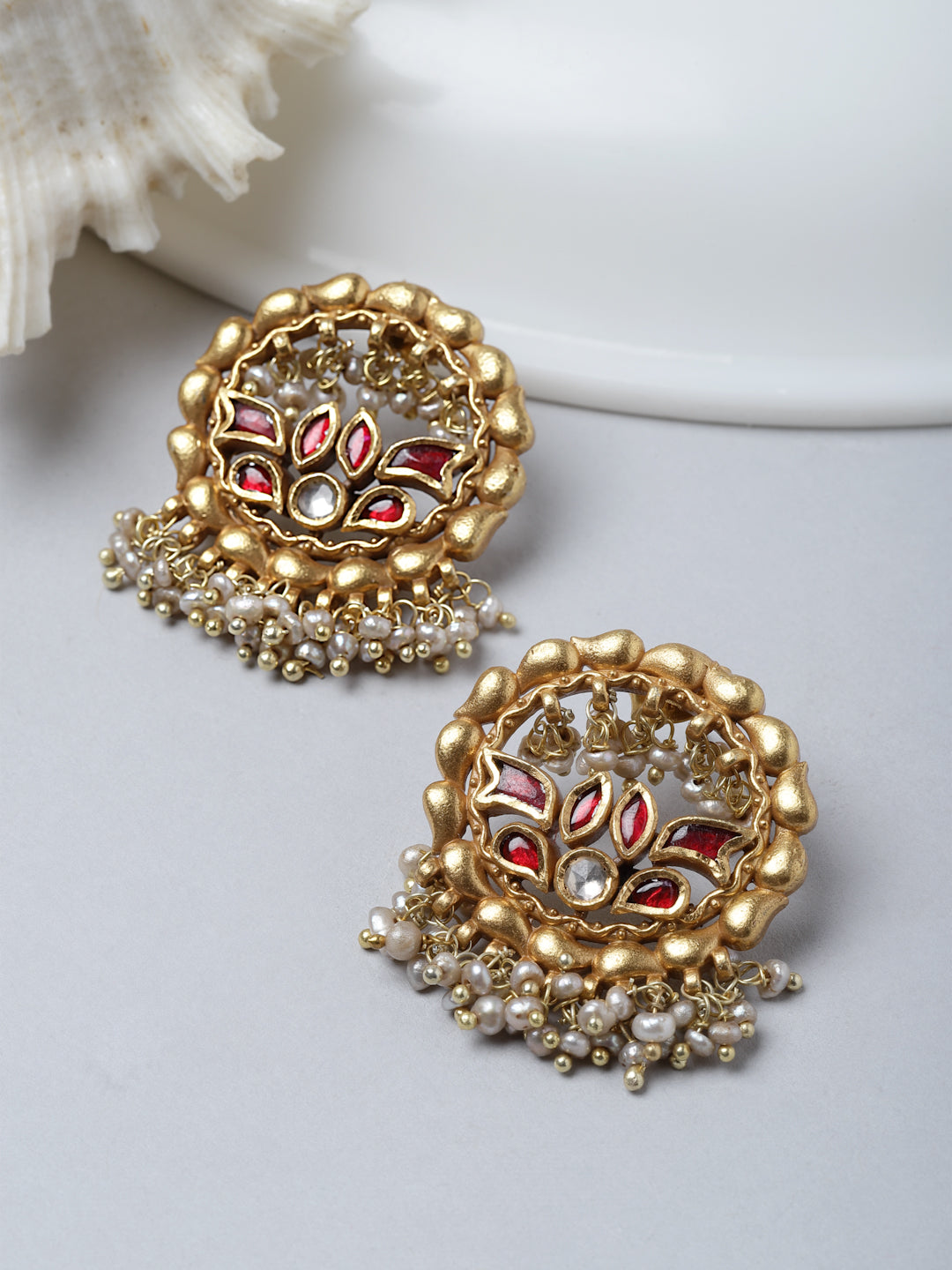 Red and white green Kundan ear tops with natural pearl drops set in gold-plated silver